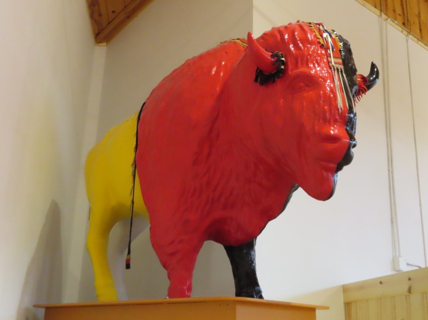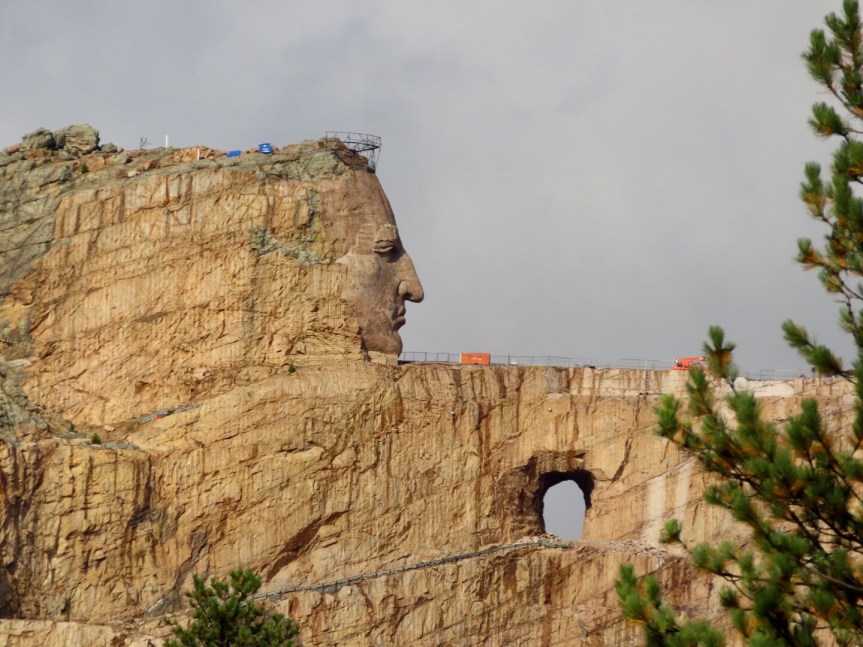 The fog had cleared by the time we reached the Crazy Horse compound and we had a clear view of the carving in progress on the mountainside where they were working on the representation of Indian Chief riding horseback. Only the face is done but work continues daily to slowly bring the figure to life from the granite stone. The museum was the best we’ve visited on the trip and held even my limited attention span for over an hour. We watched a video in the theater and then perused the exhibits and admired the artwork.