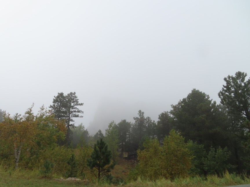 We passed through Custer as the tourist train was loading up its passengers. The main street was lined with restaurants and tourist traps, many of which were already shuttered up for the winter. A short ways up the road we came to the entry for Mount Rushmore and paid our parking fee. The girl at the gate assured us that our fare was good for multiple entries in case the fog and mist obscured the view too much.