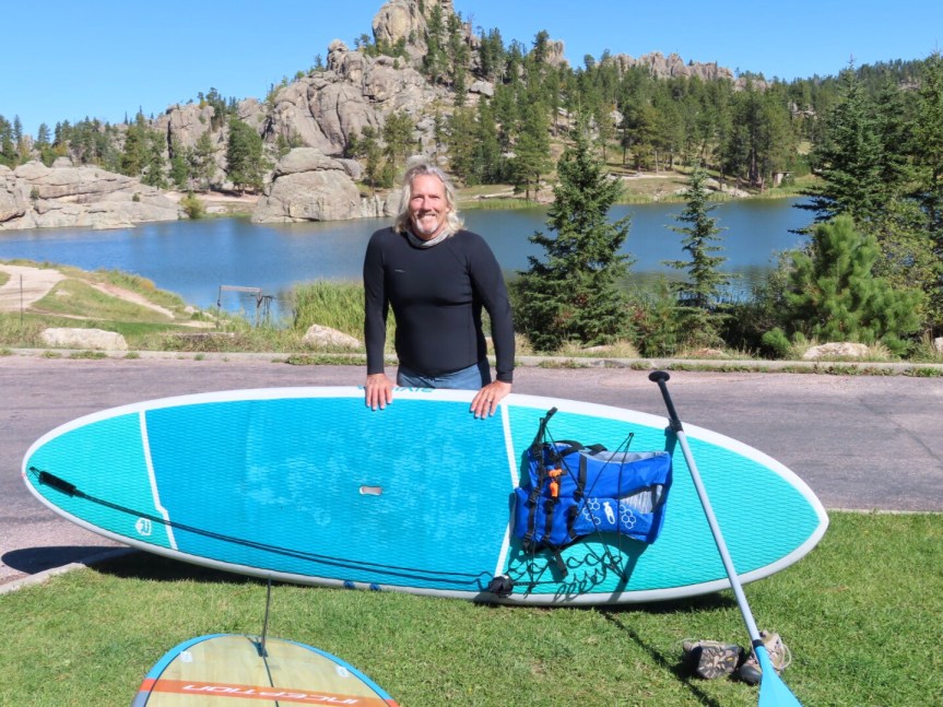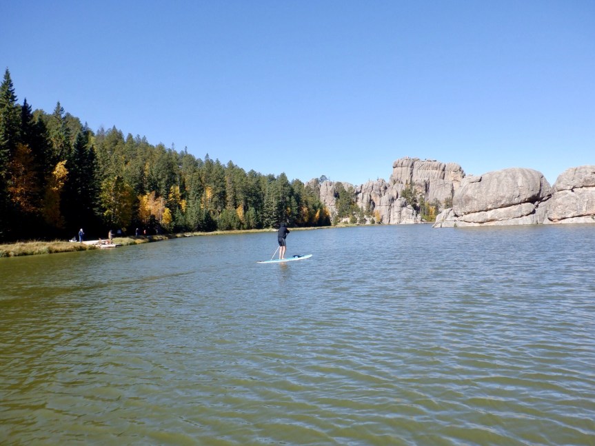 By now, the temperatures had reached a balmy 37 F, so what else is there to do but go paddle boarding? We drove over to Sylvan Lake. Not the largest body of water in the park but one of the most picturesque. Boulders rise out from the deeps and form a wall along the far edge of the lake creating a dam that holds the lake in place. We put in on the shore near the small dock and stroked our way down to the dam.