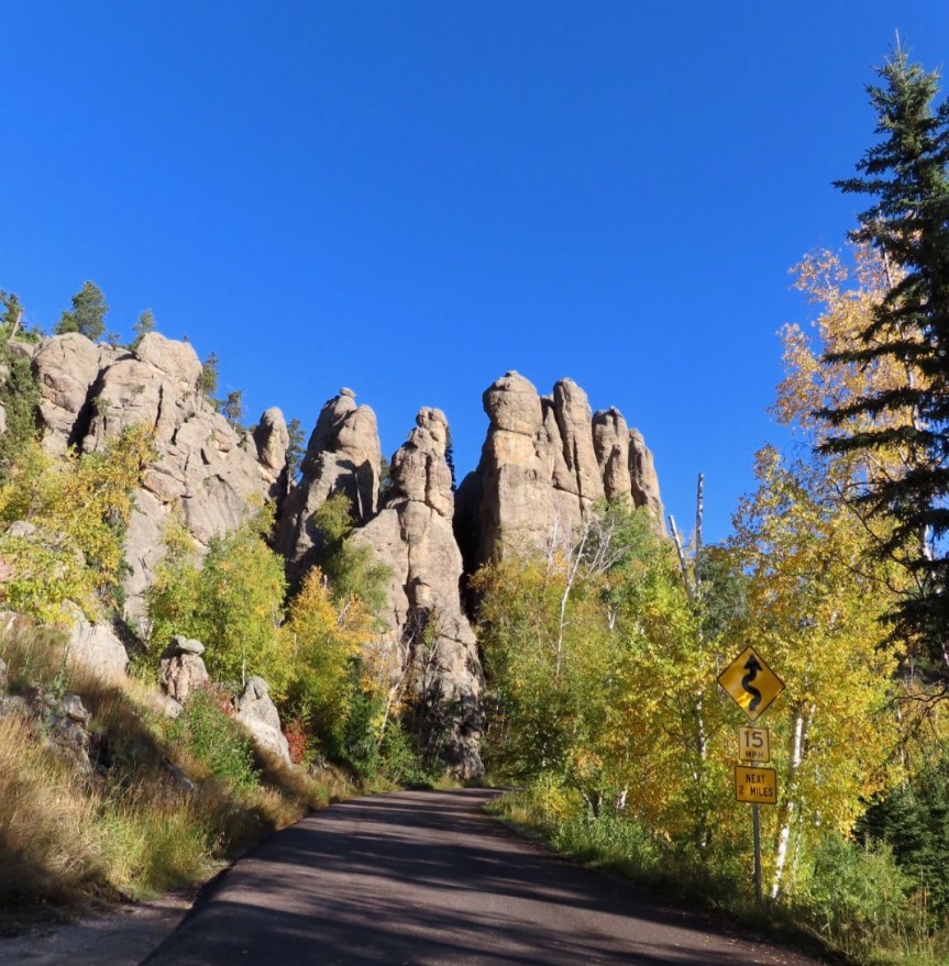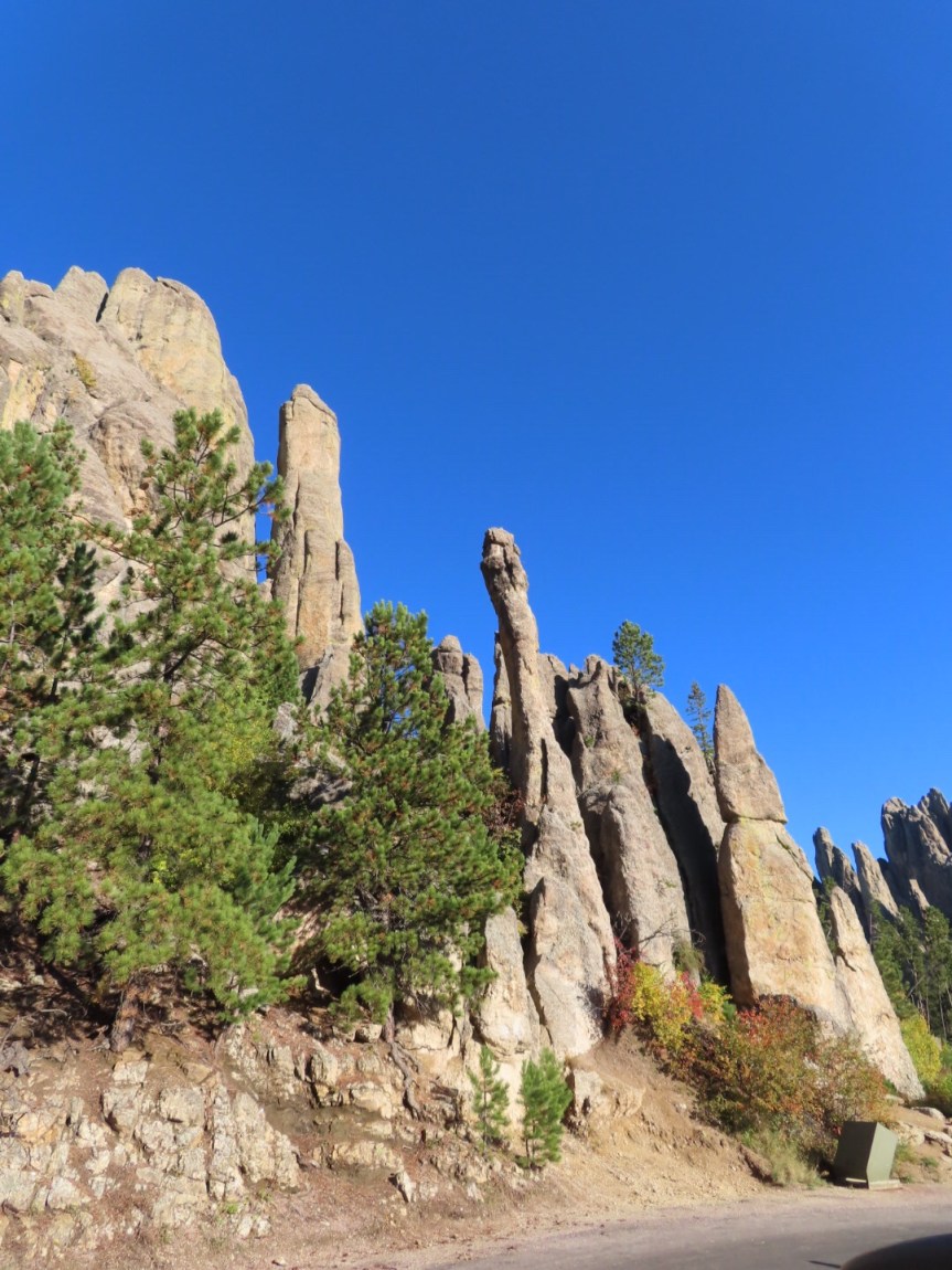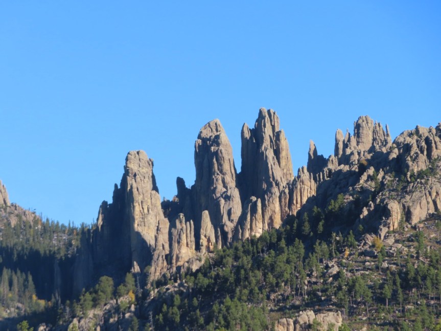 It takes some time to get anywhere in Custer Park. The roads were designed for viewing and exploring not moving around quickly. Although the campground was only ten miles or so, it took a half an hour to get there. We arrived ten minutes after noon and the grumpy camp host was hovering around on his golf cart getting all huffy that we weren’t out on time. Hey, the sign on your free site says ‘Camp Host’ not ‘Camp Dick’. We were in the wrong and freely admitted it and apologized, but there are better ways to interact with your clients. Everything was already packed and ready from this morning so it was just a matter of starting up the rig and driving out. This guy definitely should find a job where he doesn’t need to have contact with the public.