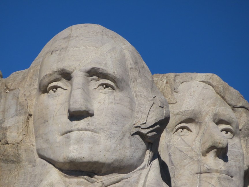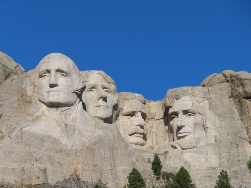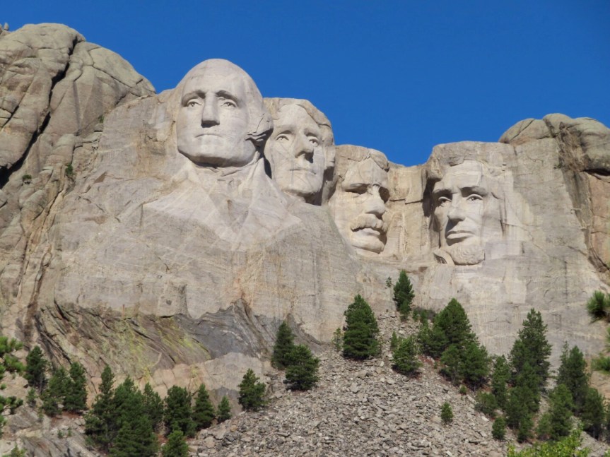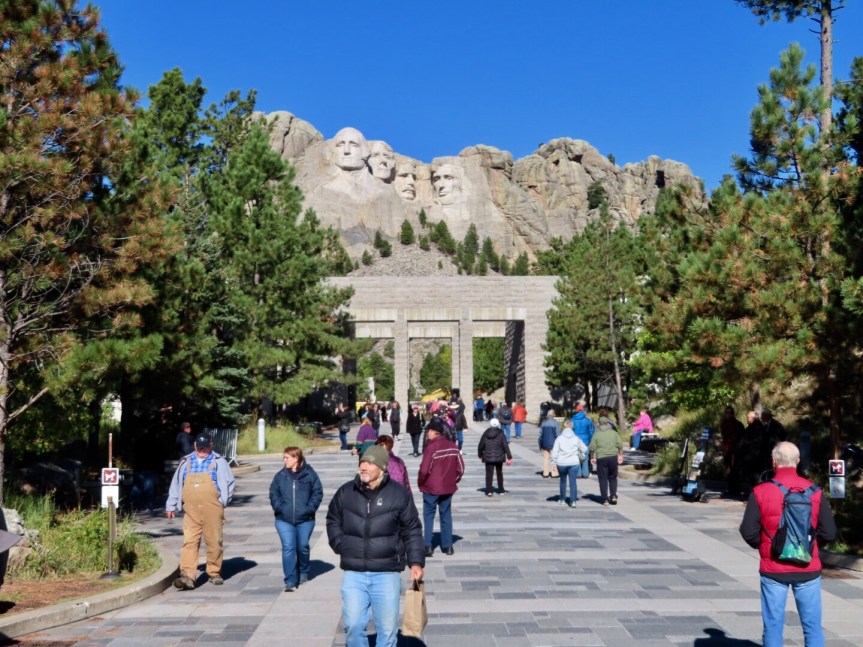 We reached Mount Rushmore and our entry from yesterday was good for today also. The skies were clear and, yes, there actually are carvings of four presidents up on the granite walls of South Dakota’s Black Hills. There was a moderate crowd of tourists like us, but they just added to the energy of the visit. Parking was easy and the vibe was very upbeat. After admiring the intricacy of the artwork, pondering the planning and foresight to get it so perfect and getting an infusion of national pride, there’s really not much else to do. We spent maybe 45 minutes and are really glad we made the effort to come back this morning.