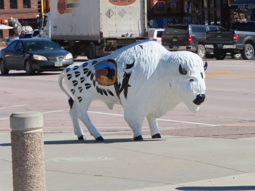 Another drive through the cute little tourist entry point of Custer. They have these fiberglass buffaloes spread around town that artists paint up and display on street corners or in front of businesses. They have bears like these in New Bern, Carolina and fish in Detroit Lakes, MN. I’ve always appreciated them and we spotted quite a few on the way through town.