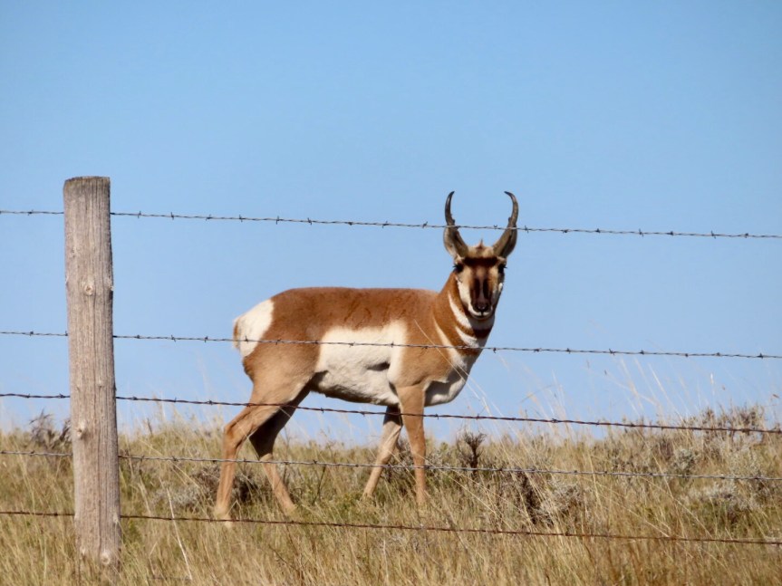 In Upton, there is a large facility to mine Bentonite, a clay used for things as diverse as lipstick to kitty litter. The coal mining near Gillette had a gnarly looking pit of despair hollowed out next to the road. Kind of what you’d envision hell to be like, just ignite a few of those chemical laden ponds of tailings to add the flame effects. A few antelope loitered near the fences grazing on the plentiful grass and watching the traffic go by. Deer hunting season must have just begun as trucks were parked up along the roadside and guys in neon orange beanies were roving over the rolling hills. One lucky hunter was emerging onto the shoulder with a large buck toted on his back like an oversized knapsack.