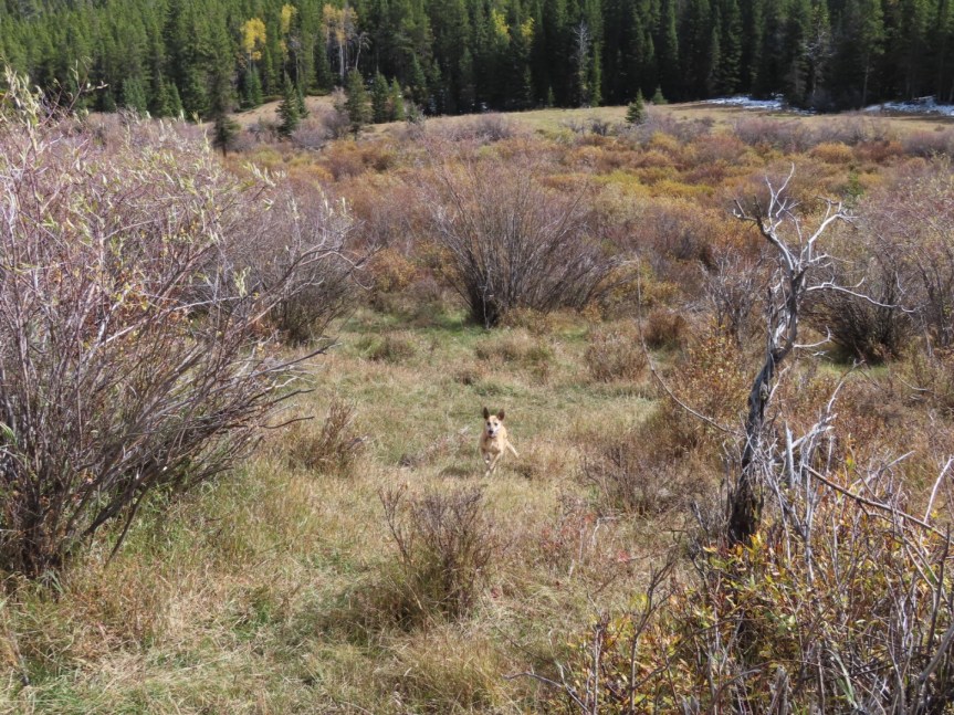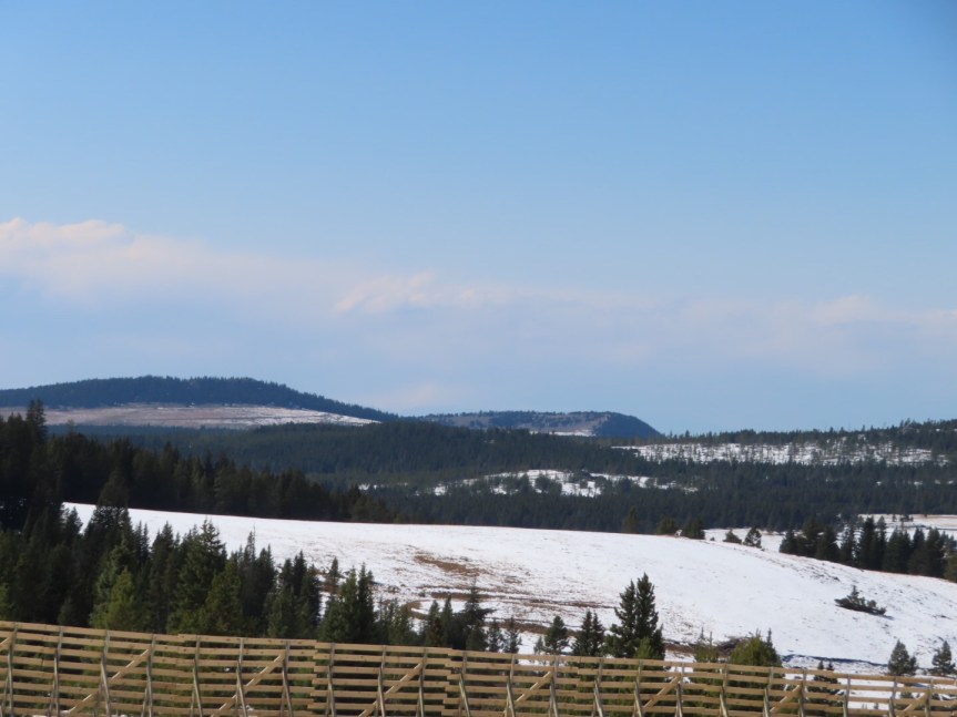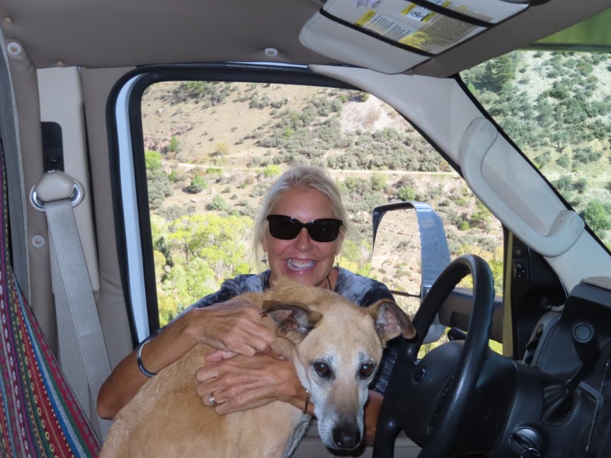 The campground in Buffalo emptied out as the morning passed by. We hit the road by eleven and topped off the propane for when we get to Yellowstone. As we left Buffalo in the rear view mirror, the highway starting going uphill into the Big Horn mountains. We took a side road at Sourdough because we were told we might spot moose up there. No moose, but a beautiful spot to park for a while and let Cali run free as PJ write some cards and I hiked around the hills seeing if I could find any wildlife. Only Cali but she was wild enough.