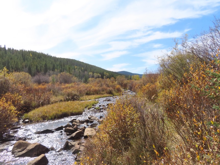 We topped out at 9666 feet at Powder River Pass. It was Cali’s first time ever seeing snow. By the look on her face, I don’t think she was any too impressed. She walked gingerly over the six inches or so of snow and was happy to be on the other side. The views were spectacular as we began the downhill descent on the western slopes.