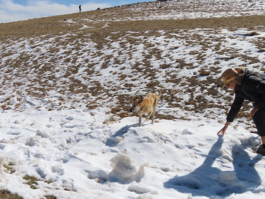 We returned to highway 16 and just around the corner we came face to face with the snow covered peaks we had been admiring from down below. Loaf mountain was the closest of the tall mountain tops. There were very few other people at the overlooks so we were able to take our time and Cali roamed freely in the grassy fields next to the pull outs.