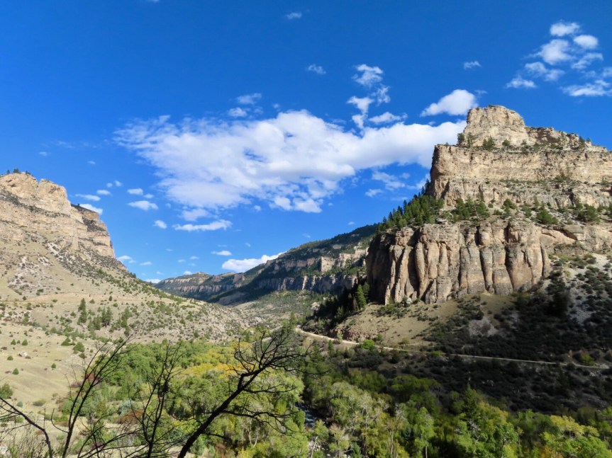 Large rock formations rose up from the plains below looking like they were straight out of a set for a cowboy movie. A local in an old battered Chevy was having overheating issues so I stopped to offer some water. A canyon ran along the base of the drop off below the road with a sparkling creek flowing through it.