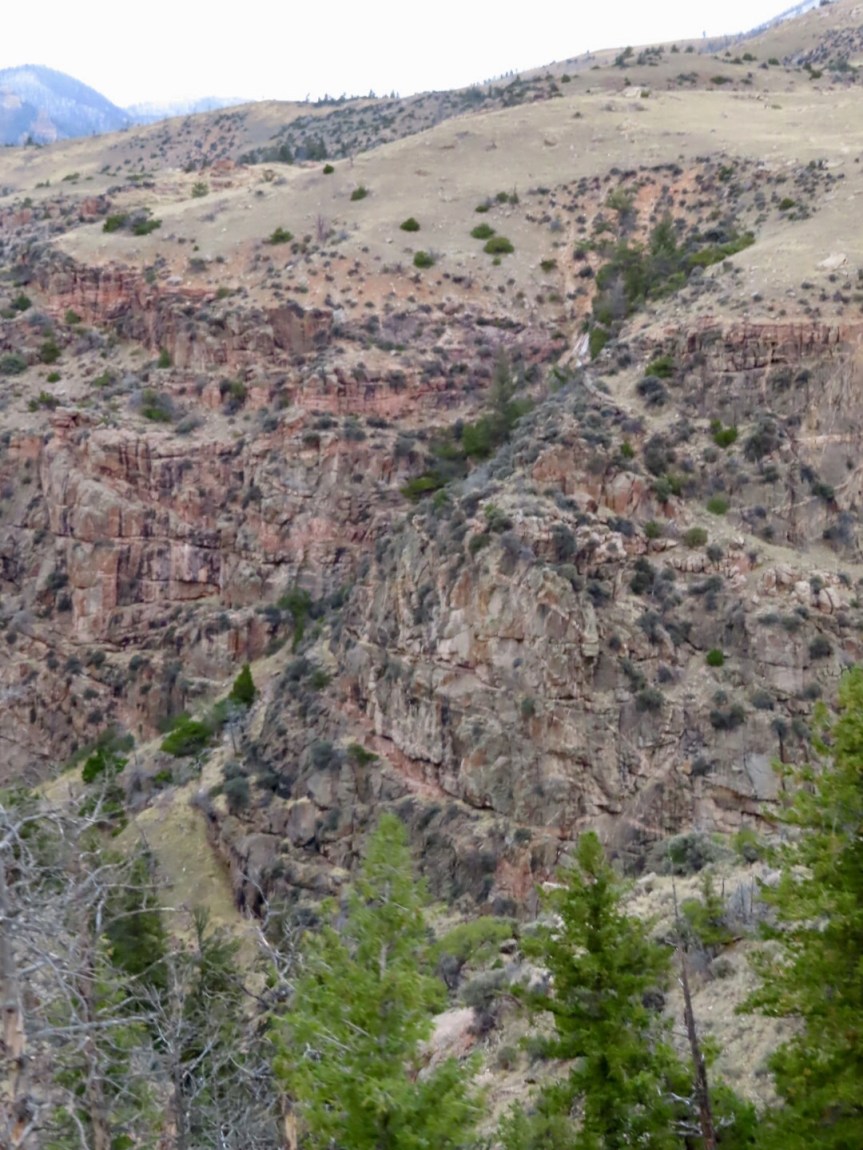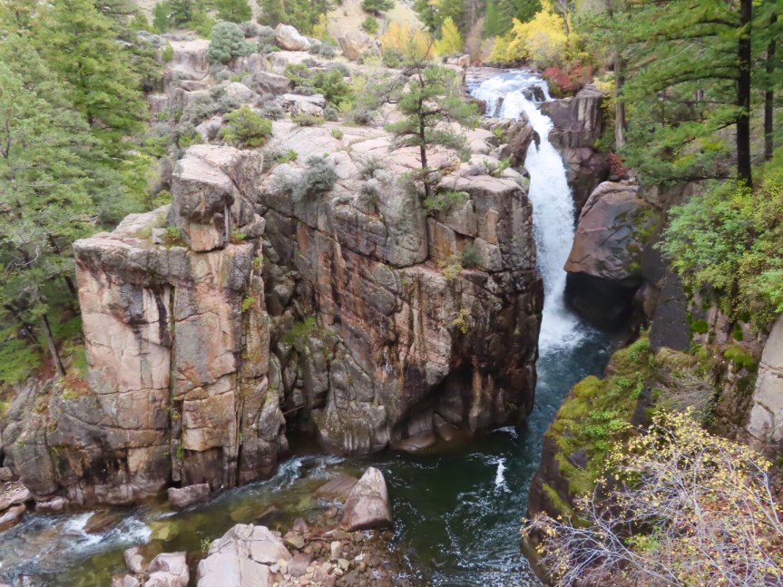 As we drove into the national forest, the landscape began to change. First we passed red rock canyons and rock formations reminiscent of Arizona or Utah. We followed a deep valley up a narrow pass until we reached a water fall on the left. The pull out and parking area had been closed off and shut down for the winter so we parked outside and walked on in. The falls dropped off a colorful mesa into a cleft in the rocky valley floor. There was another smaller waterfall on the west end of the draw that PJ and I spotted when we were sneaking a pee in the bushes on the back side of the closed up interpretive center. Beautiful scenery on every side.