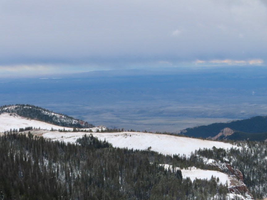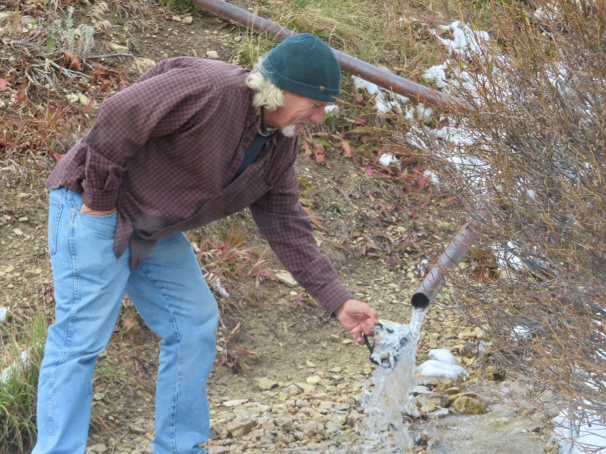 With full bellies and warm fingers, we climbed still higher in the mountains. There is a natural spring that has been tapped along the side of the road. A couple of guys from way down in the valley were there filling up a truck full of five gallon jugs to take home. I used my new mug to fill up on clear, ice cold water, as fresh as it gets. We stood around talking to the other gents until we started getting chilly then we went to the summit to look over the valley.