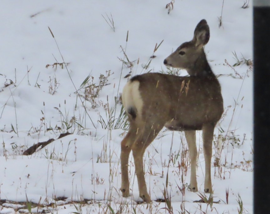 The views were amazing. We were looking all over for elk or maybe a moose but we only came across a few small deer on our wanderings. We admired the snowy vistas then it was time to head back down to Basin below. The clouds had closed in a bit and a few short flurries of snow came and went. Before long we were back in town and returning home in time for a marvelous manicotti dinner that Debbie had been putting together while we were out playing.