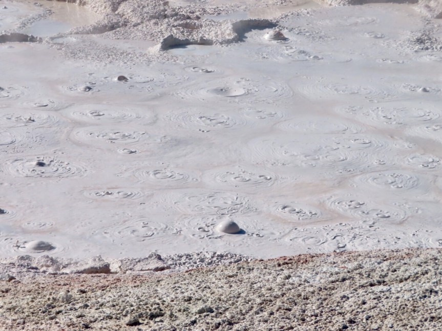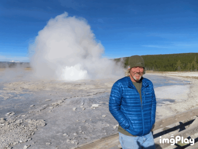 We returned to camp to let Cali out stopping in West Yellowstone, Montana to pick up some bear spray. We figure if we’re going to be out hiking around, it would be better to be safe than sorry. We ate some lunch and had a nap before heading out to see some of the geothermal areas nearest the campground. We started at the Mid Way Geyser Basin where a boardwalk took us out over a plain with boiling blue pools, burbling mud pots and a set of geysers that were going non stop.
