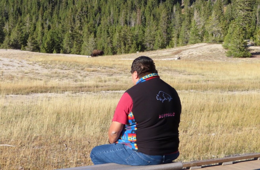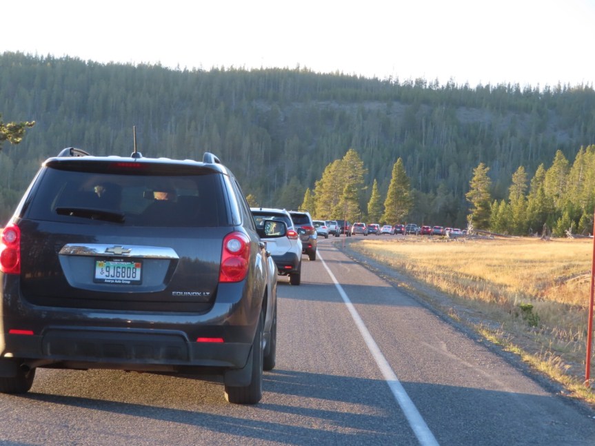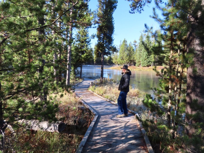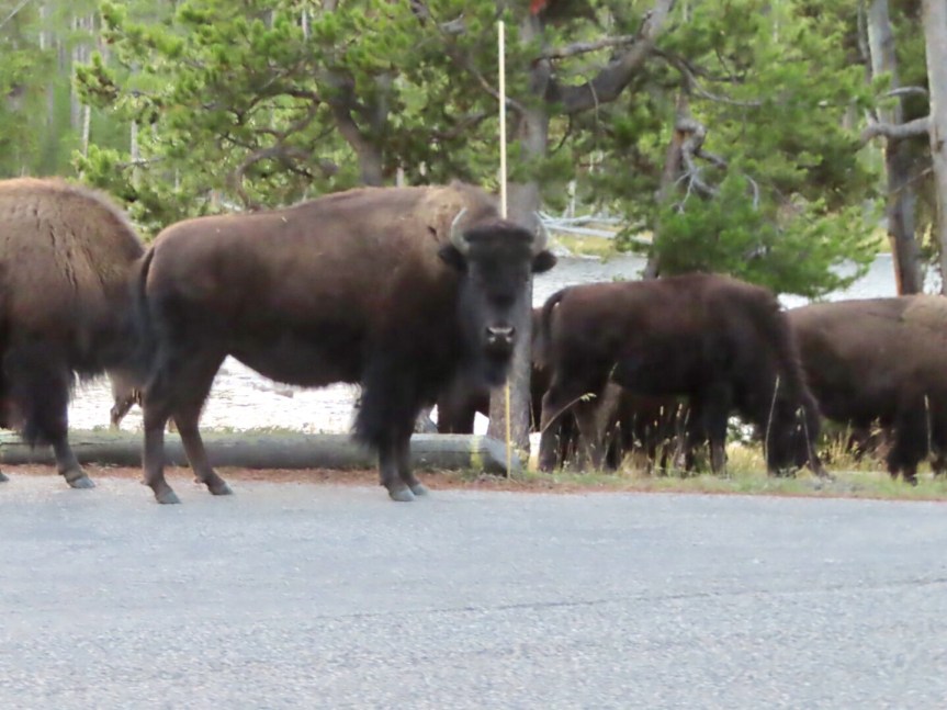 There’s a small park just inside of Idaho where the natural springs that bubble up from the earth form the source of the Snake River, Idaho’s most famous water way. At the outlet of the stream, they hatch trout that go down and populate the rivers below. There is no fishing allowed until several miles downstream so the trout at the upper pool are large and unafraid. We drove through mountain forest and open range through a sliver of Montana and into Idaho. Lots of bison and even a few elk along the road.