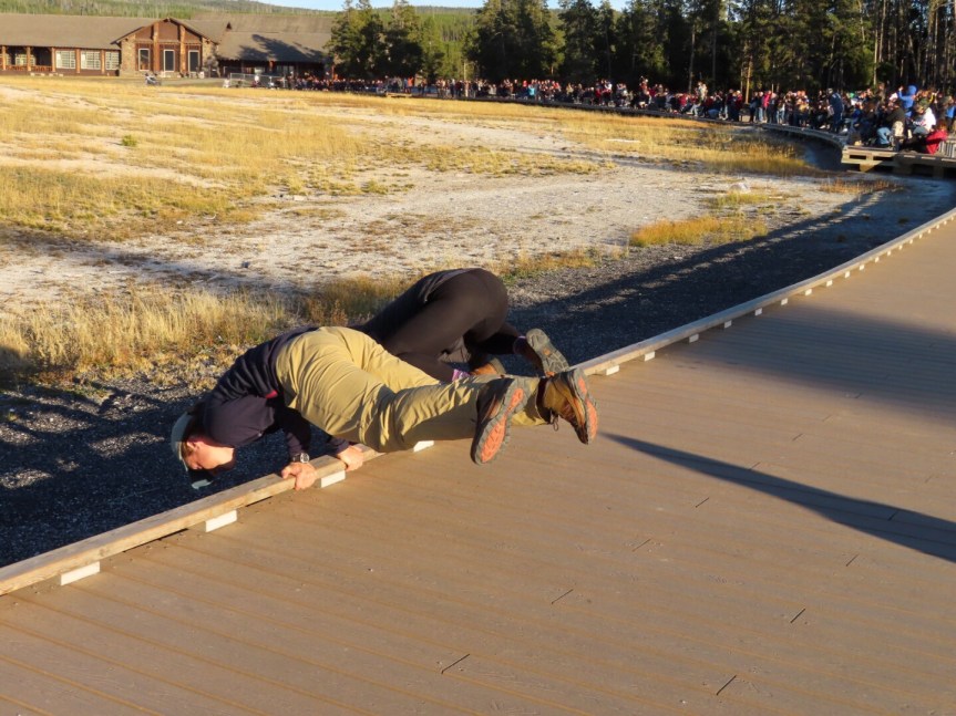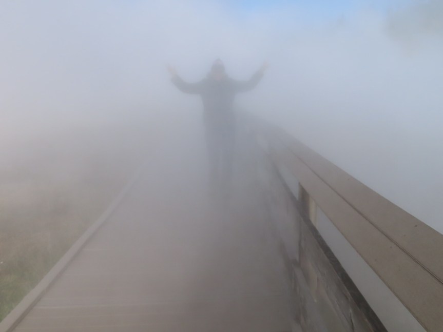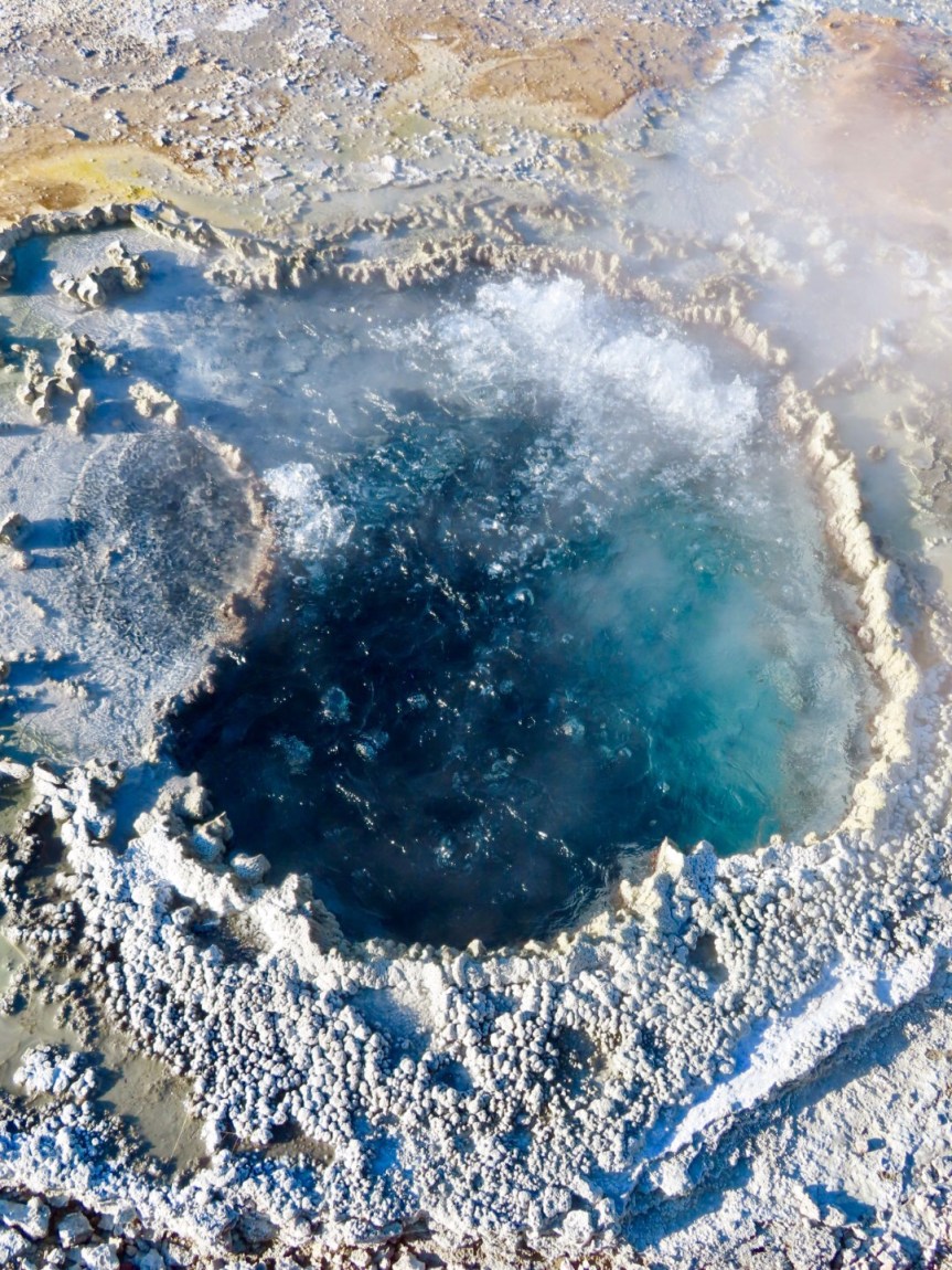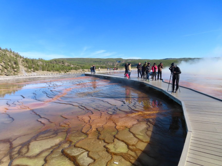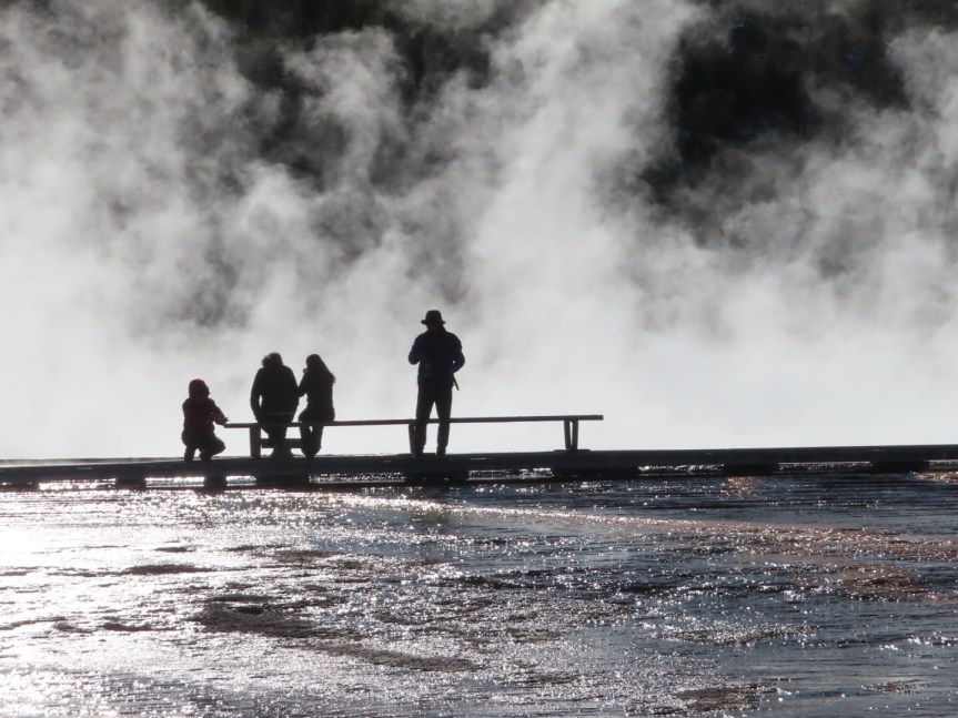 We followed a long boardwalk past some steaming multi-colored hot pools where at times the steam would engulf us hiding us from the world. Then we joined the onlookers at the prismatic pool with its different colored rings leading to its translucent blue pool in the center. It is so large it is hard to get the full view from ground level. One day, we’ll have to hike up the mountain to see it from above.