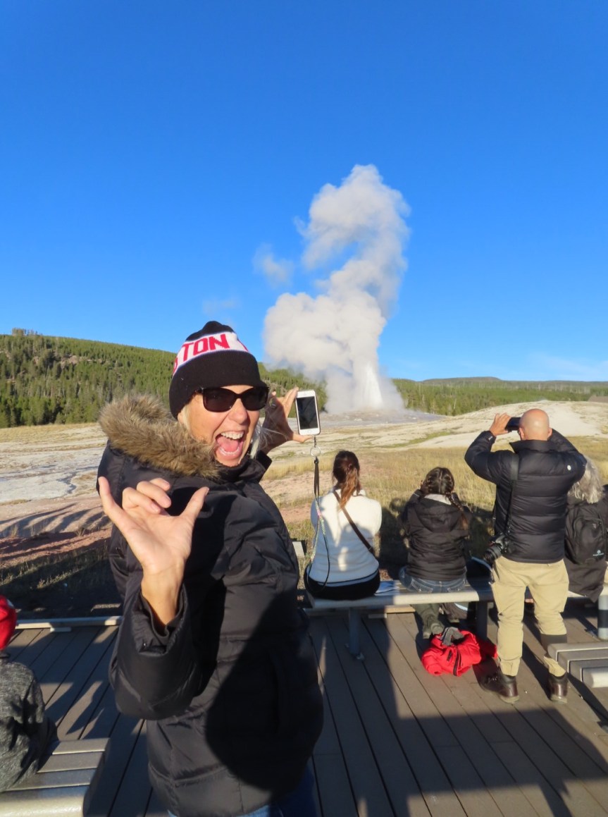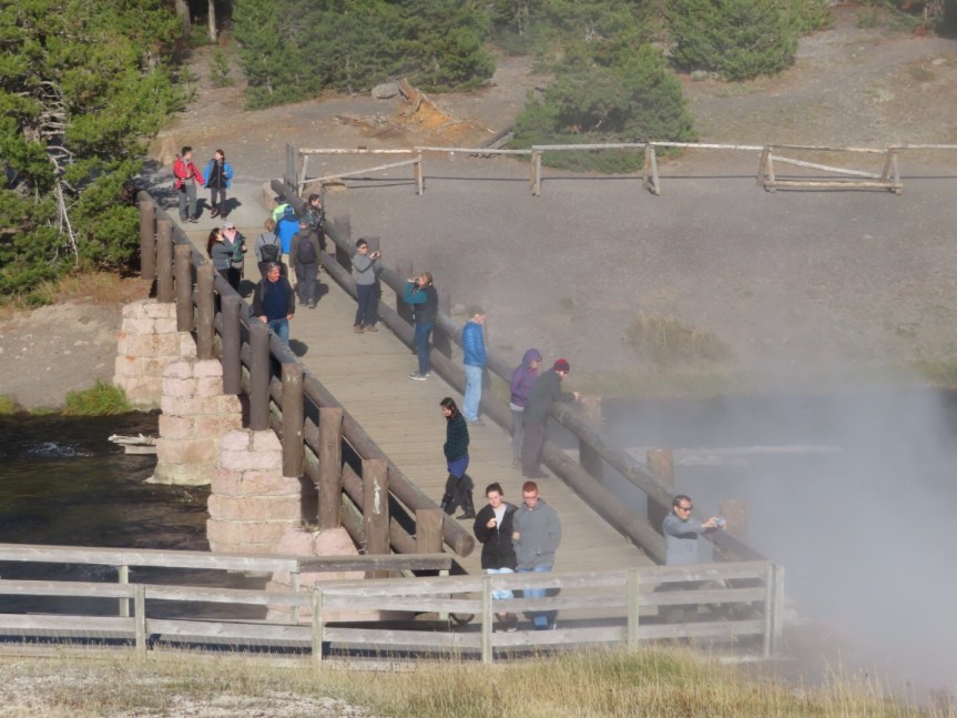 I am still surprised at the volume of people wandering the park for such cold weather and being so late in the season. Granted, although chilly, today was beautiful and sunny. We pulled into the grand prismatic pool with a heap of other tourists. We had to troll the parking lot like we were at college with a nine o’clock class. On our second loop around, we finally beat one of the other dozen or so cars playing musical chairs and got a space. This area was gorgeous. We first crossed the river where hot water ran down steaming into the cold water.