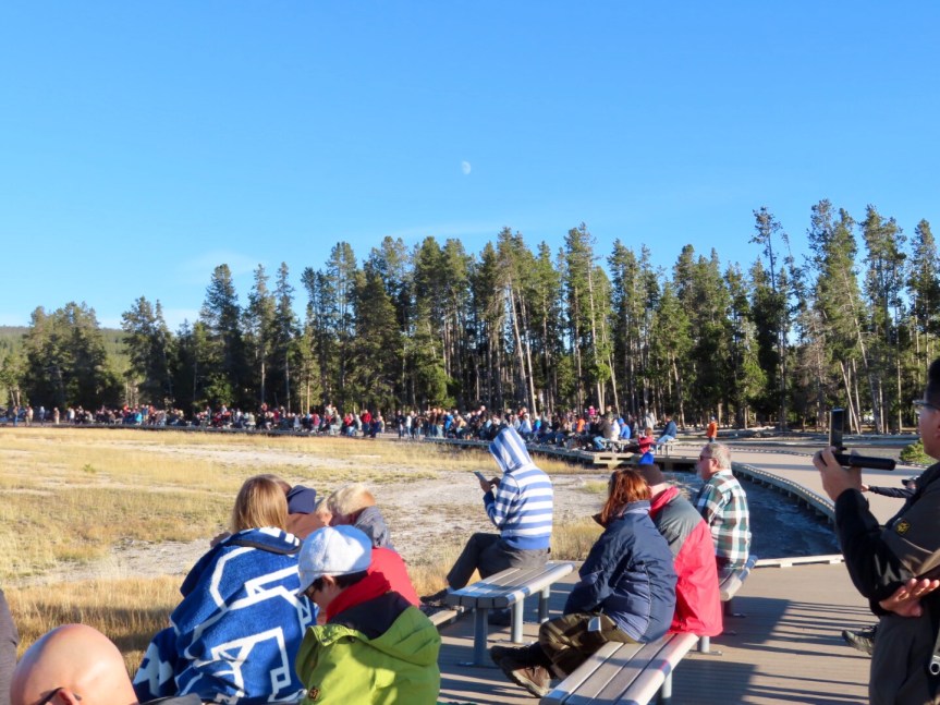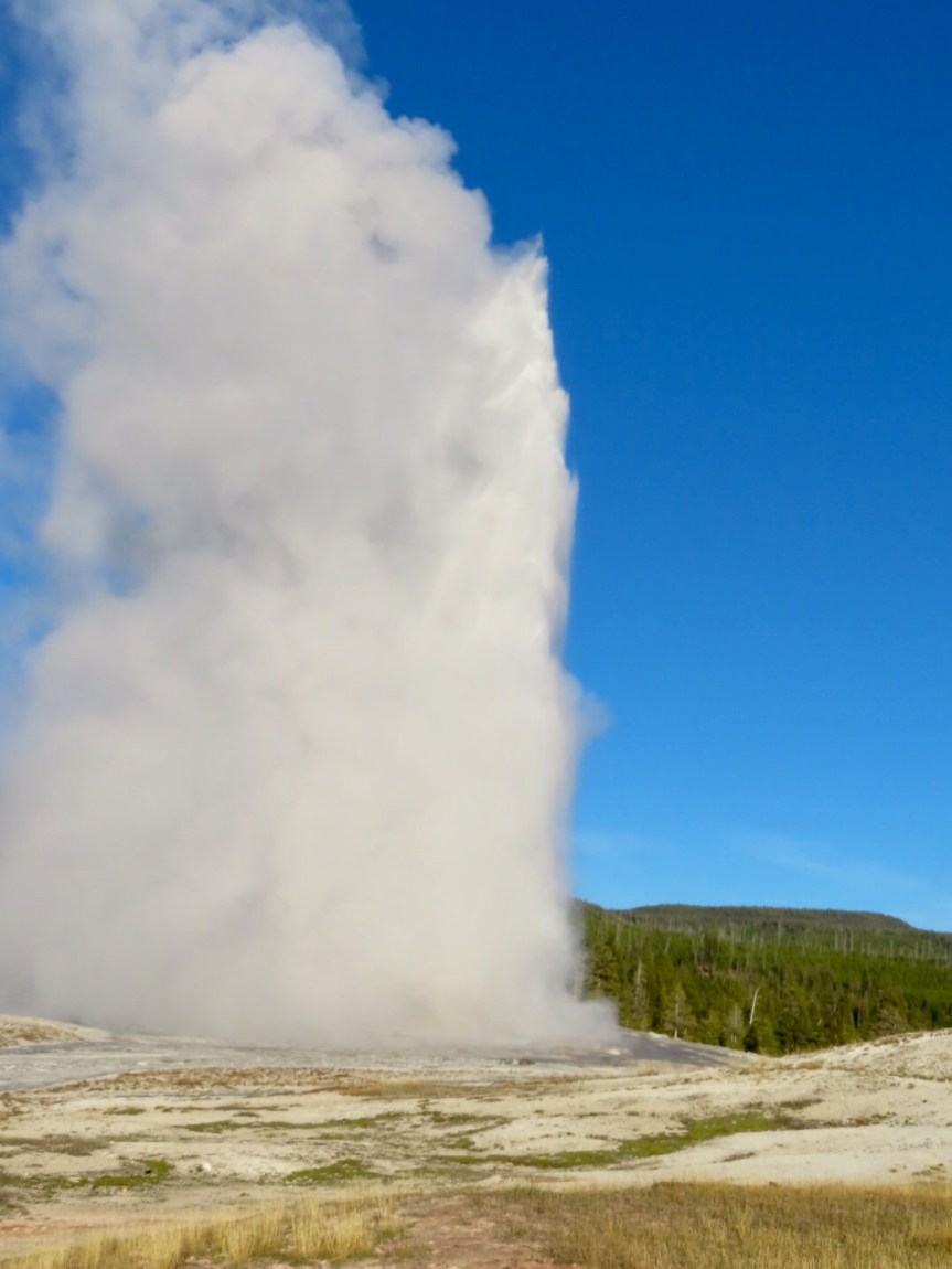 Next up was the most famous hydrothermic feature of Yellowstone, Old Faithful. We arrived with 50 minutes to spare before the next cycle. We hiked along the south side on the trail checking out smaller boiling pools until we came upon a large bull buffalo grazing next to the path. He was a little too close for comfortably walking by so we retreated and headed back to the bleacher like benches lined up around the geyser. Sure enough, it erupted right on time and put on a dazzling display for about ten minutes. It was definitely something to see.