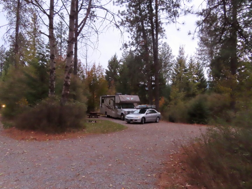 Our campground for the night was only twenty minutes further along. We are one of only two campers in the park for tonight. No problem getting our choice of sites. Cali likes it because she can run free and there are deer to sniff at. Super quiet and private. Easy, fun driving today.