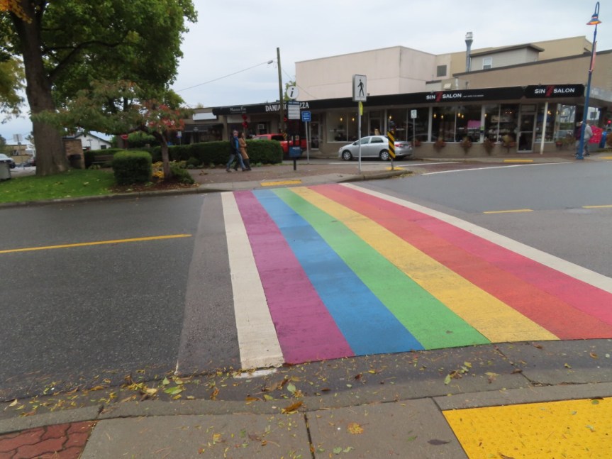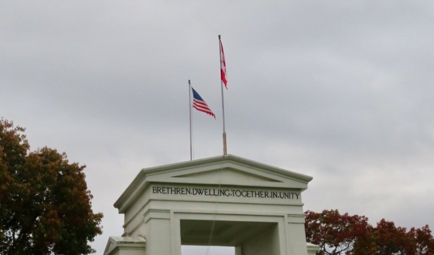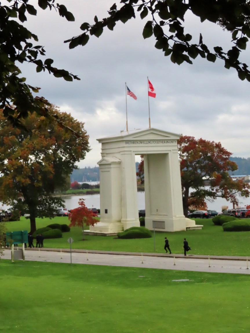 PJ’s retreat at the Semiahmoo Fish and Game Club began at 9:00 this morning. I drove her on over and left her at the door then took a few neighborhood streets over to the Peace Arch memorial that sits at the U.S., Canada border. I parked in front of a house on the curb and walked across the grass to the arch. A large group of uniformed Japanese students were posing in front of the memorial and admiring the gardens. I briefly stepped into the U.S. then returned to the car and decided to explore some more.
