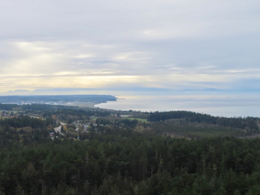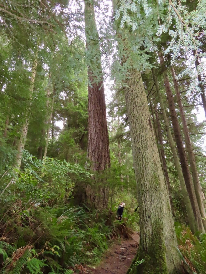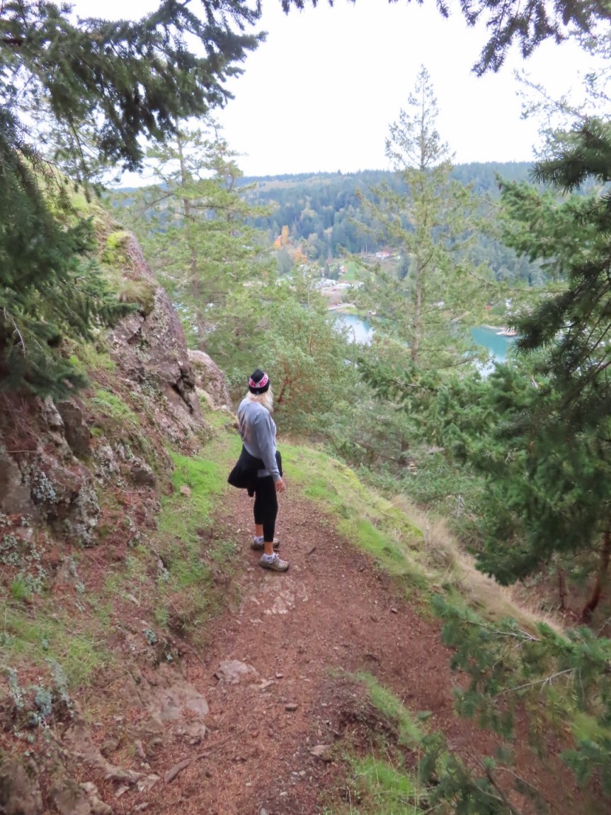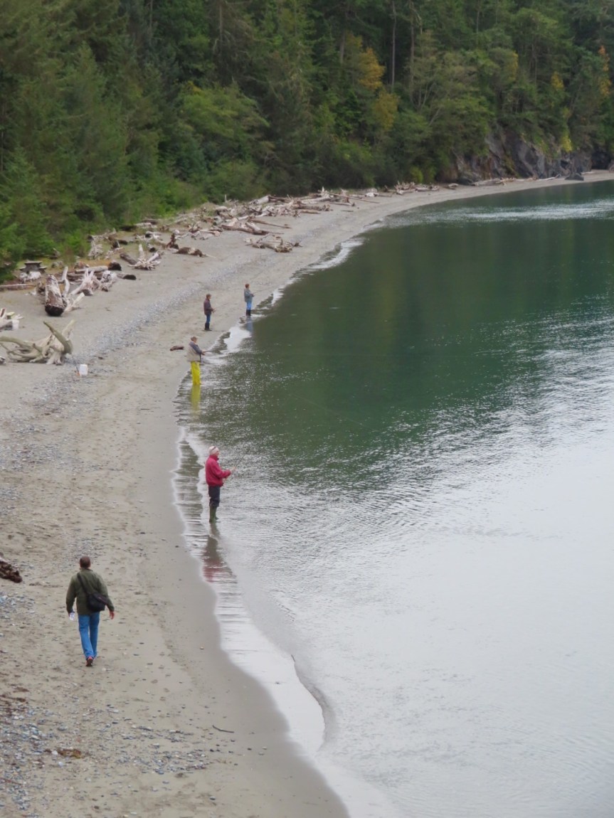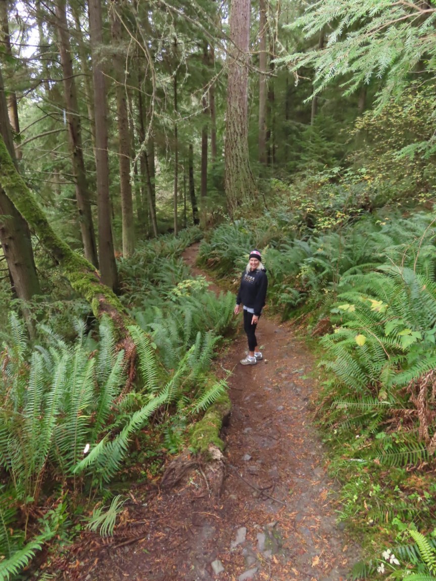 We descended on the far side of the escarpment to explore the green watered inlet that is hidden on that side. We were turned back at the closed gate at the Boy Scout camp so we did the return loop on the perimeter trail. We reconnected with our original trail near the bridge and followed that back to camp. A three hour hike in the northwest rain forest. A truly scenic and beautiful area of the U.S.