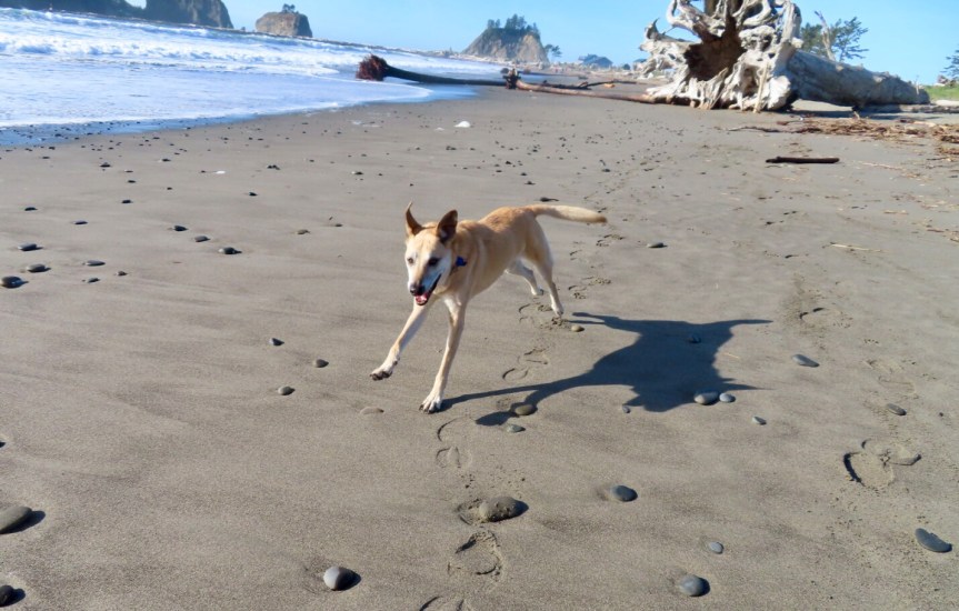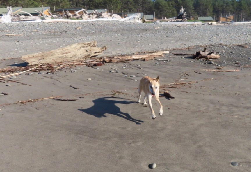 We walked down the beach, a stereotypical northwest strand covered in driftwood and tall trees that had been washed up onto the cobblestone shoreline. I can only imagine the power it must have taken to move something this large high up onto the dry sand. Cali was loving running free and made a few new canine pals as she pranced around the beach. We are parked right on the shore with ocean views out of every window.