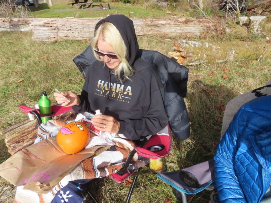 The morning was spent just basking in the sun and the zen atmosphere of the campground. Pretty much everyone left by ten o’clock leaving us to rule the roost. We sat in our chairs on the bank of Taft Creek listening to the sound of the water rushing over the rocks. PJ painted on her pumpkin while I posted a blog and practiced on my wooden flute. The ravens in the tree overhead enjoyed the off key sound and answered with music of their own. Cali had free reign and poked her nose in every bush and hollow she encountered on her ramblings.