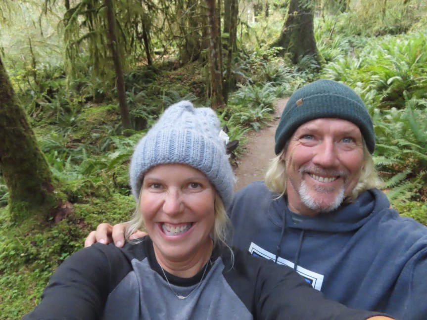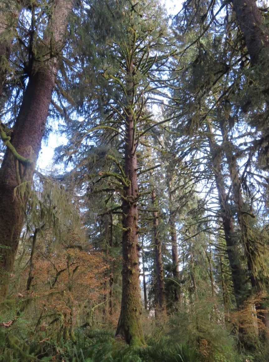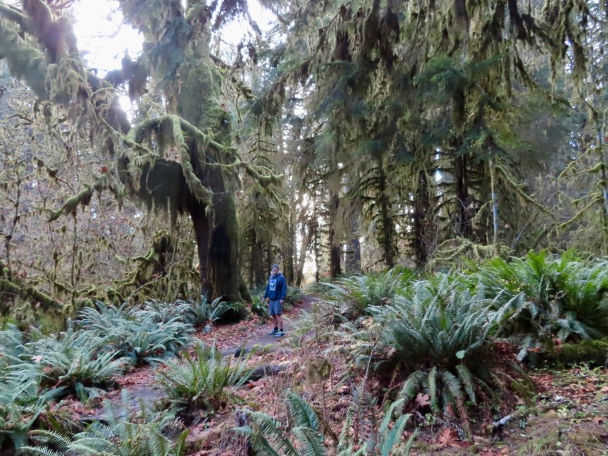 Later in the day, as a few campers started trickling in, we walked over to the visitors center and had a quick look inside at the center. Not much to it, a couple of chotskes for sale and a large relief map of the area. We hit the Hoh River Trail and hiked into the forest for an hour or so until we saw the shadows growing long and began to worry about getting caught out in the dark. The trail zigzagged around through the oceans of ferns, lush trees and endless assortment of mosses.