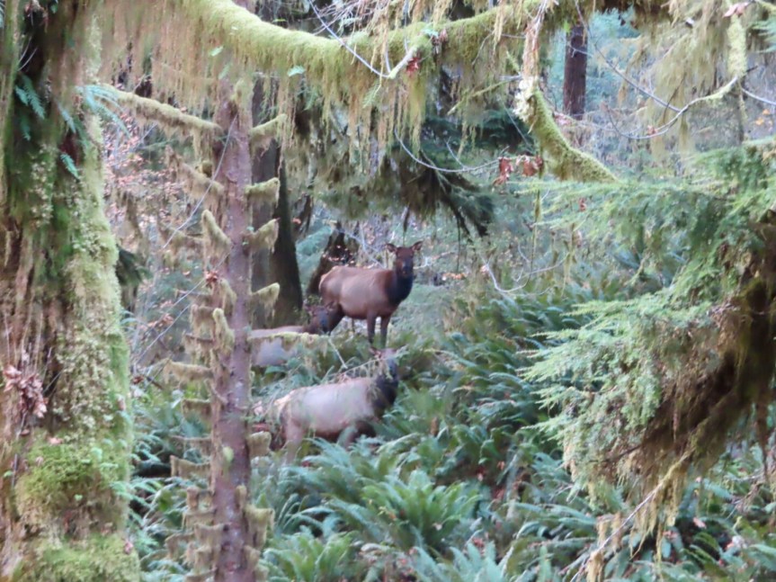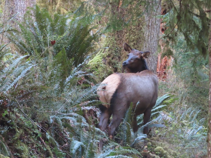 Evening was settling in as we were hiking out and the few other straggling hikers had already departed. The silence was palpable and the animals were starting to come out. Woodpeckers startled us flying low and crossing just a few feet in front of our faces. As we quietly rounded a bend, the large white hind ends of the massive elk gave away their positions among the trees. We all stood still watching one another until the shyer members of the herd hustled off over the rise. One large elk was unafraid and continued his grazing, rubber necking as we slowly walked past.