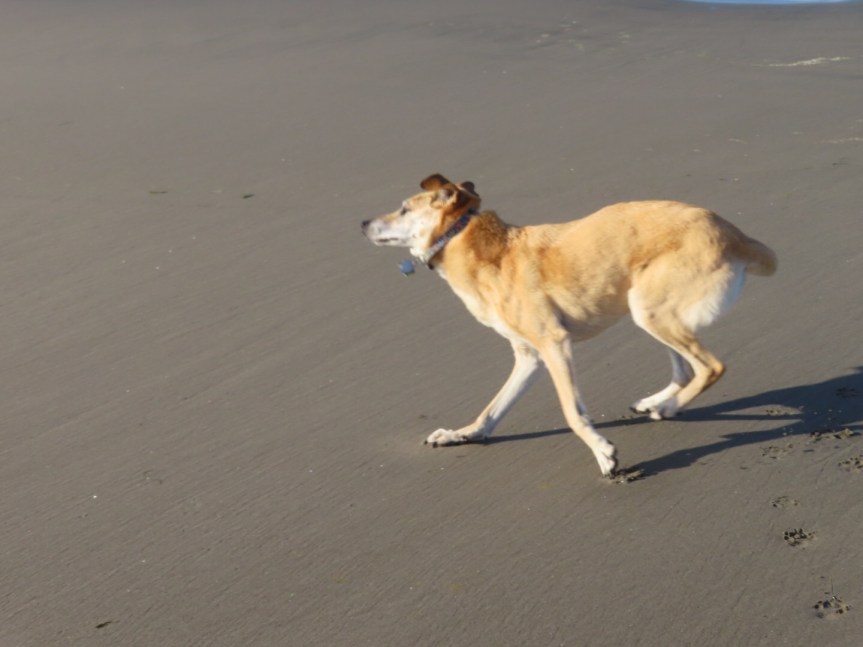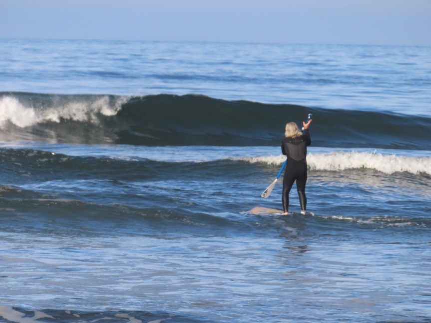 When I went out to walk Cali this morning, there were a few nice little waves rolling in out front. The wind had calmed and small lefts were breaking along the sandbar in front of the lighthouse. After driving up to the kiosk to book us in for another night, it was time to test my resistance to the freezing water. By now, the air temperature was getting close to 50 just about an even match for the water.