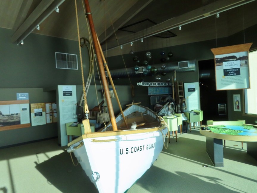 We have been criss crossing a lot of the areas that Lewis & Clark traversed during their explorations just a little over 200 years ago. Here at the mouth of the Columbia River is where they reached their goal of finding a way to the Pacific Ocean. They camped here as they mapped out the geography of the area before wintering across the river in Oregon. On Cape Disappointment near the lighthouse there is a museum with artifacts and history of their adventure. We off loaded the bicycles and set off to visit the Interpretive Center. We had to hump it up a steep hill to get to the top of the cape but the views were worth it. An eagle greeted us at the top then hid himself away in a tall tree.