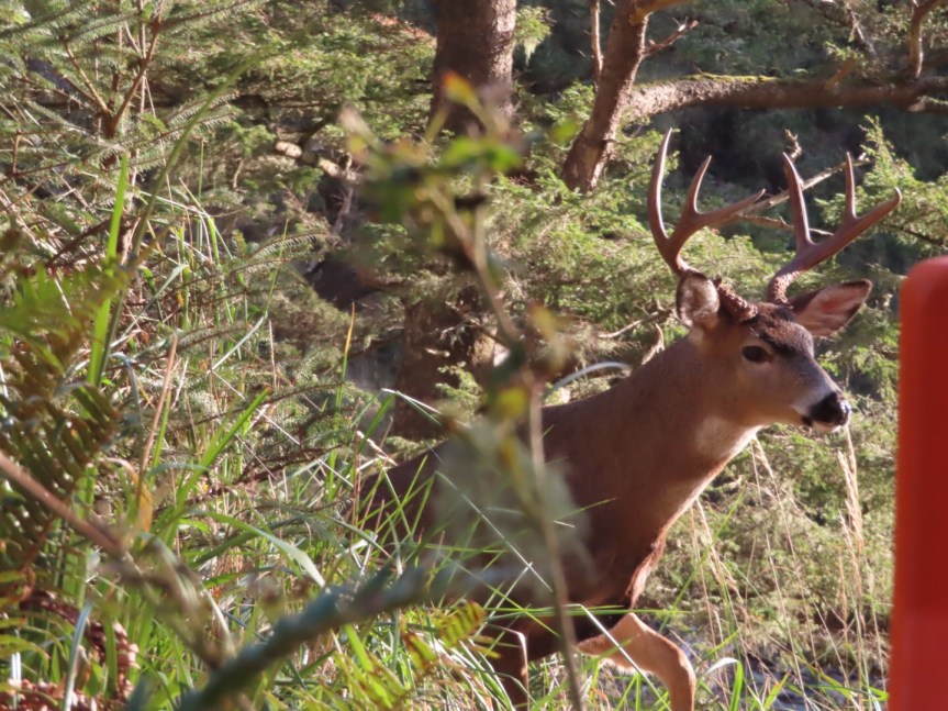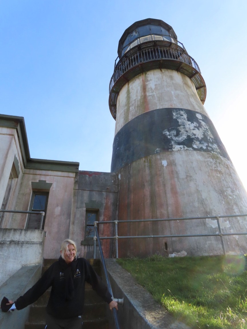 We hiked through the valley and up the far side to the lighthouse startling a deer as we turned a corner. The Cape Disappointment Lighthouse is like the red headed step brother to his North Head counterpart. No fresh paint or B&B stays here. Things are strictly utilitarian and gritty with rust and flaking paint the prominent feature. A pair of Coast Guard sailors manned the wooden shack on the end keeping an eye on boat traffic into the River.