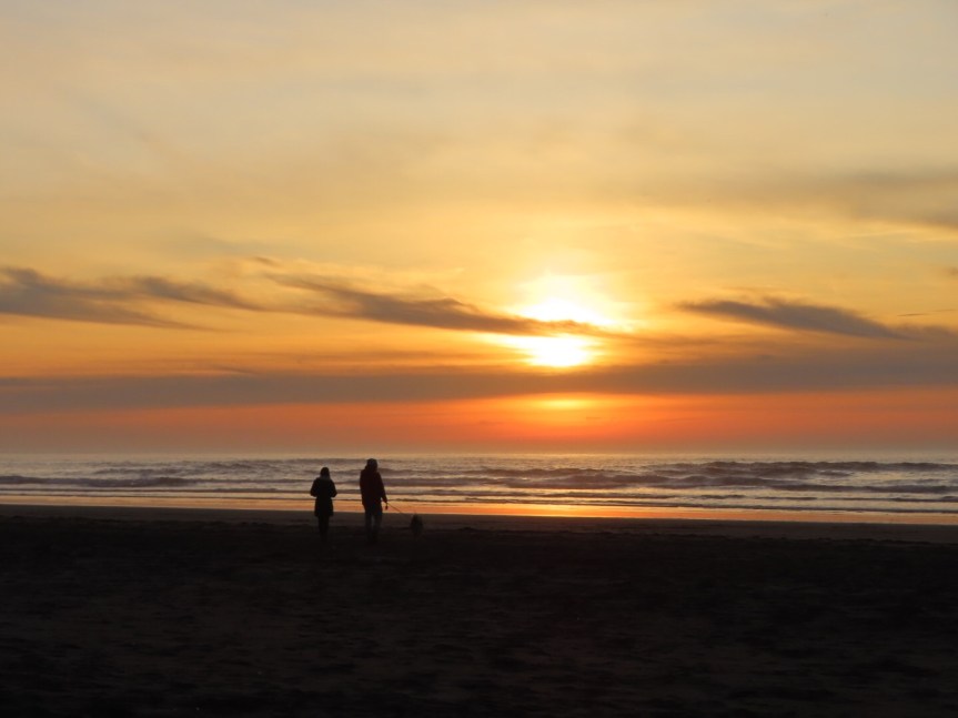 We definitely made up some time going home and arrived in time for another gorgeous sunset out on the beach with all of our neighbors. The Coast Guard had a different whirlybird out practicing for the evening session as couples strolled the sand below. A great action filled day at Cape Disappointment.