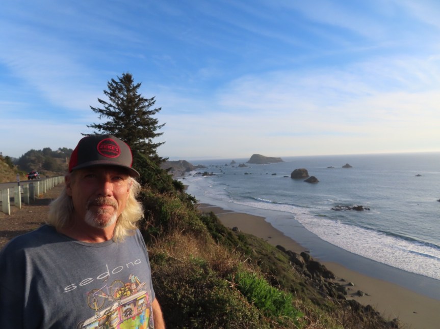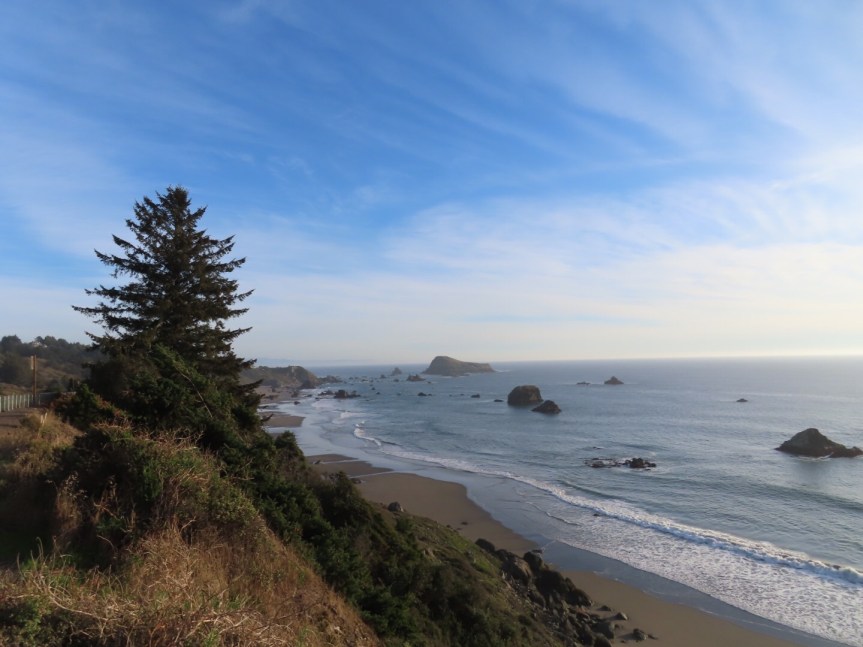 The southern Oregon coastline has that famous rugged northwest charm with lots of rock outcroppings and ‘haystacks’, single large domed islands of rock setting just off the jagged shoreline. We stopped at a few overlooks before figuring that we were burning too much daylight and might not reach our destination of Jedediah Smith State Park by dark.