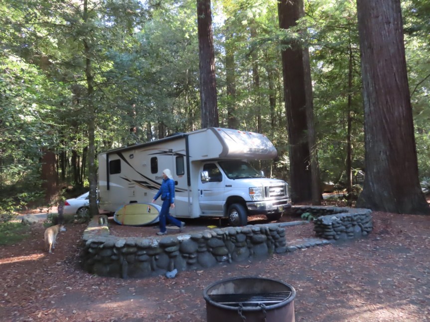 Once again, it was getting dark as we finally found our campground. The first two we tried were closed for the season. The Avenue of the Giants is amazing. A skinny little road curving between rows of massive redwoods. PJ developed a migraine right as we arrived at Burlington State Campground. We picked an open spot in the darkness and she laid down while I set up and walked the pooch.