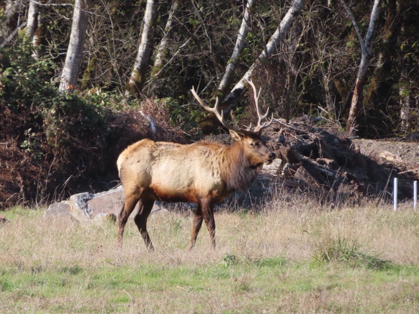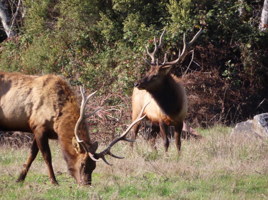 Logging trucks, fisheries and old logging towns dotted the landscape. There are areas where elk are prevalent and we happened to catch a few bucks grazing in an empty field. We parked for a while in front of the Pet Smart in Eureka catching up on some online business and picking up some bitter apple to spray on Cali’s little leg wound. She can’t stop licking it and it keeps getting bigger.