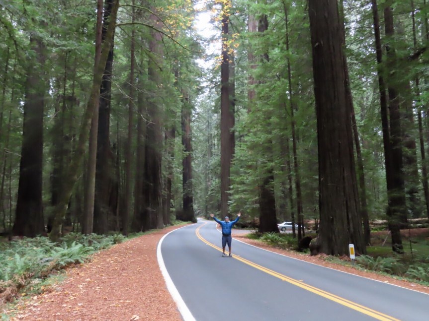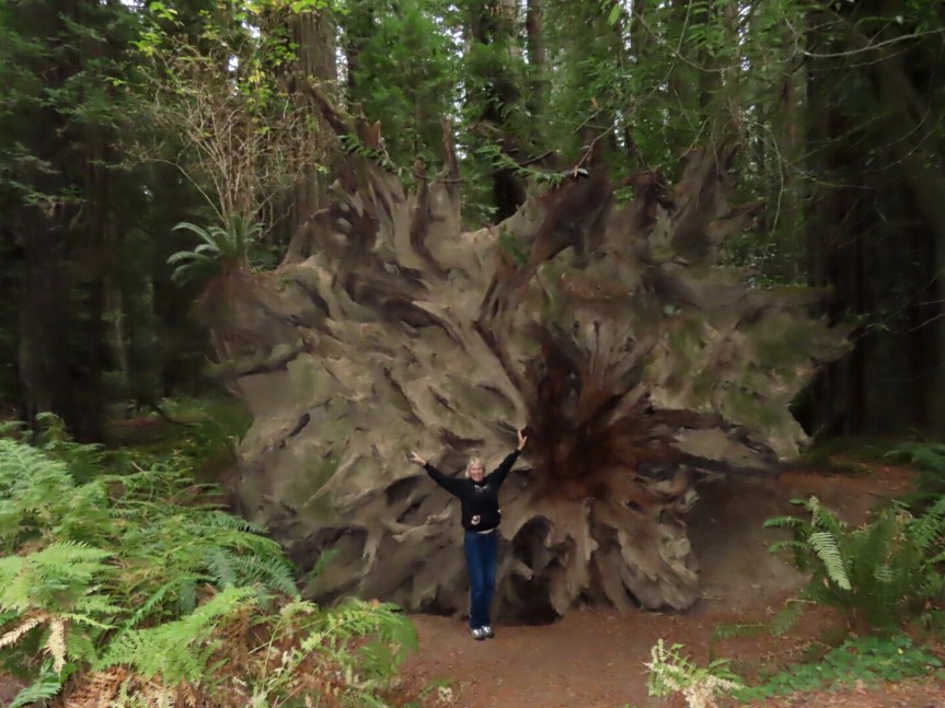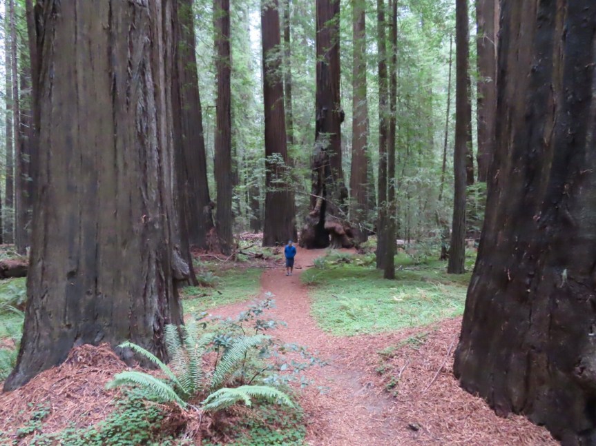 When we had finished exploring around the main trails, we drove over to the Rockefeller Forest and hiked around among the giant trees there. The main trail was a short hike, so we headed down a less traveled side track to get in a little more exercise. A nearby river, tall trees and fabulous ferns, what a beautiful country we live in.