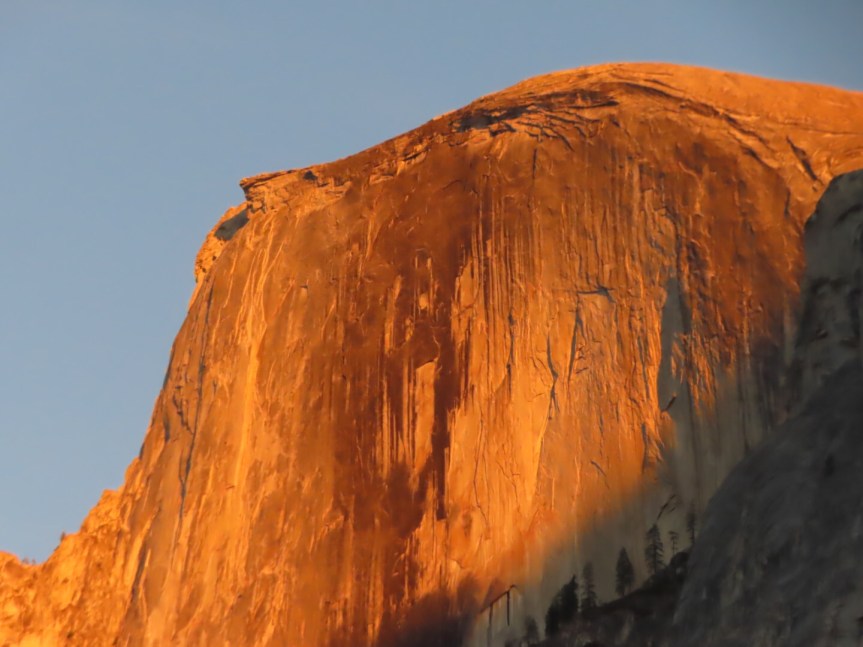 We did a quick walk down over the bridge to the closed campground on the other side. It wasn’t but a few minutes before PJ spotted a bear moving among the trees near the shuttered up stables. I tried for a picture but, in my excitement, I blurred the photos. He didn’t hang long. He disappeared into the trees as quickly as he had appeared. A deer came by to say hello as the sun burned the very top of half dome with its final rays. We headed back to camp for a quiet night.