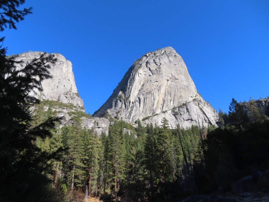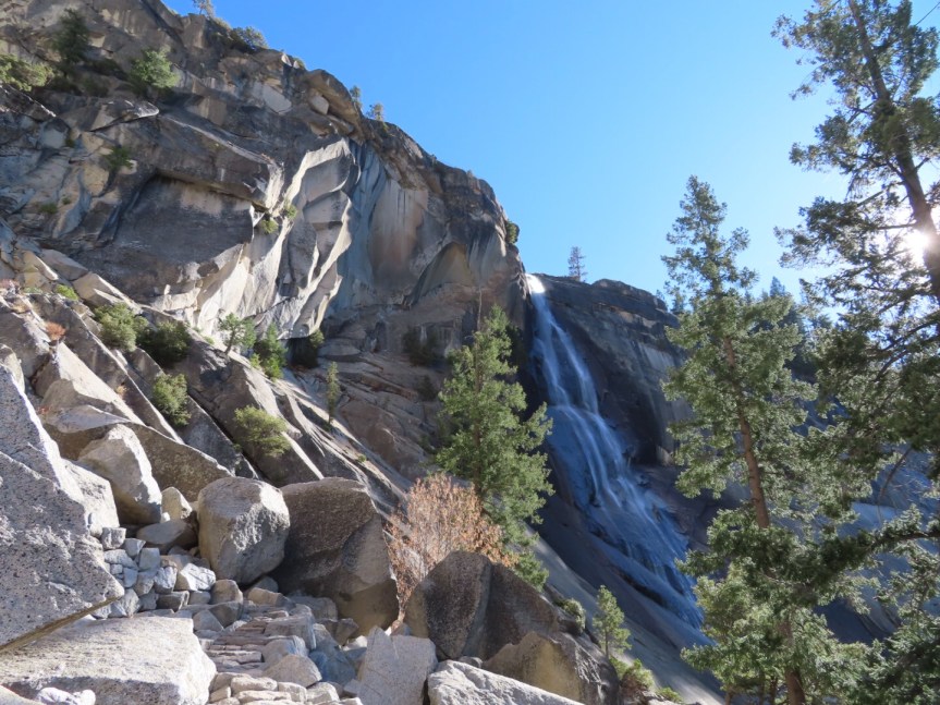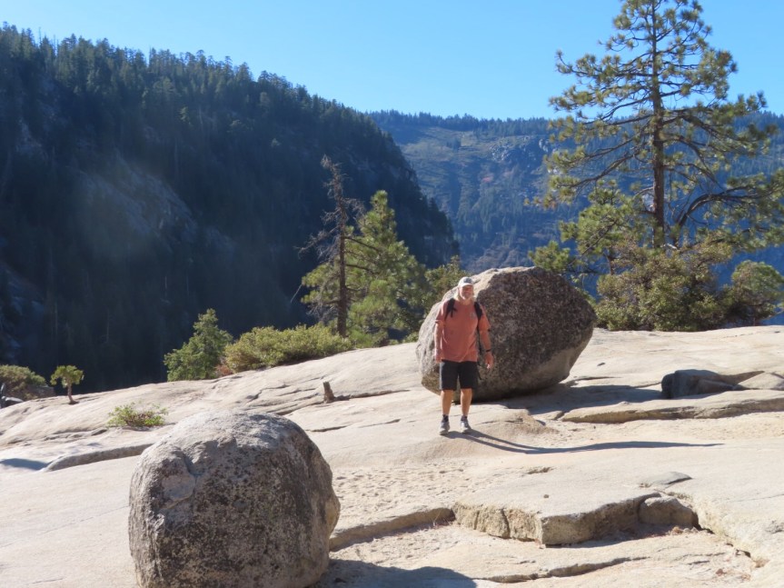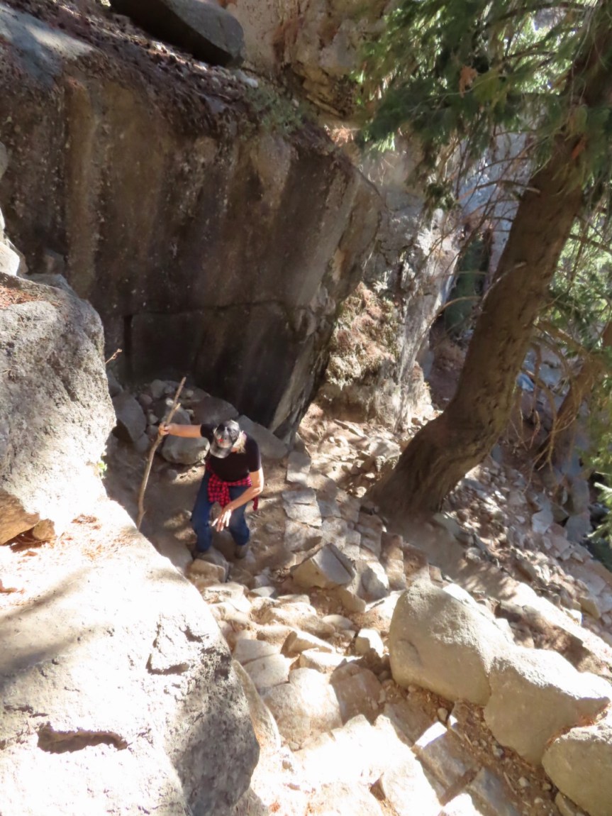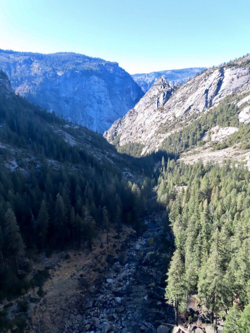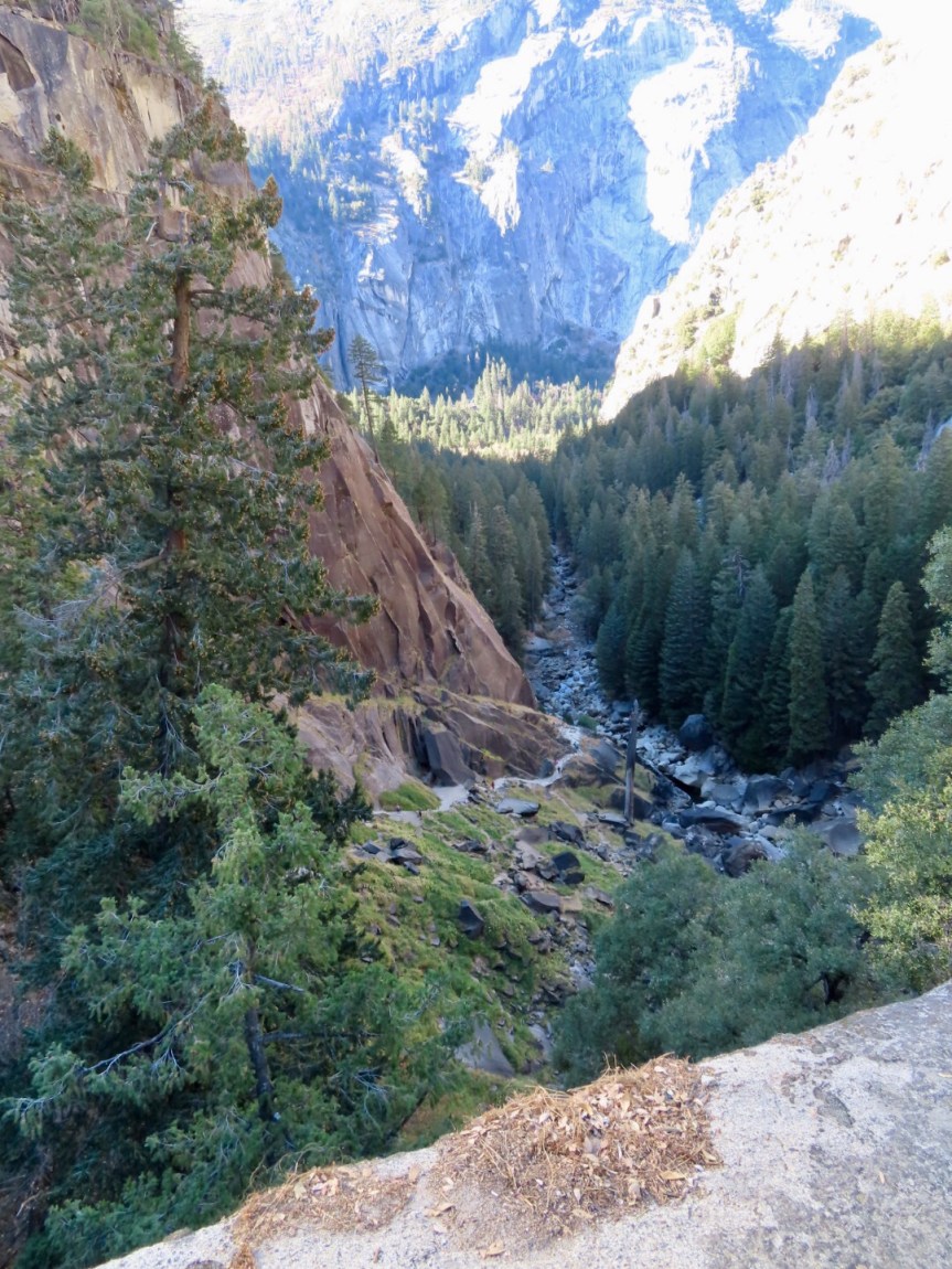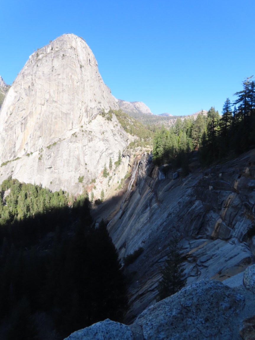 We decided to carry on and hike the trail up to Nevada Falls. It wound through the granite boulders following the cleft in the valley that has been carved out by glaciers over untold eons. The trail was steep with little room for error next to the sheer drop off over the edge into the canyon below. PJ’s acrophobia was starting to kick in, but the different angles of beautiful views of the falls kept us pushing upward. She was worrying about going back down the vertical trail more than the climbing up.