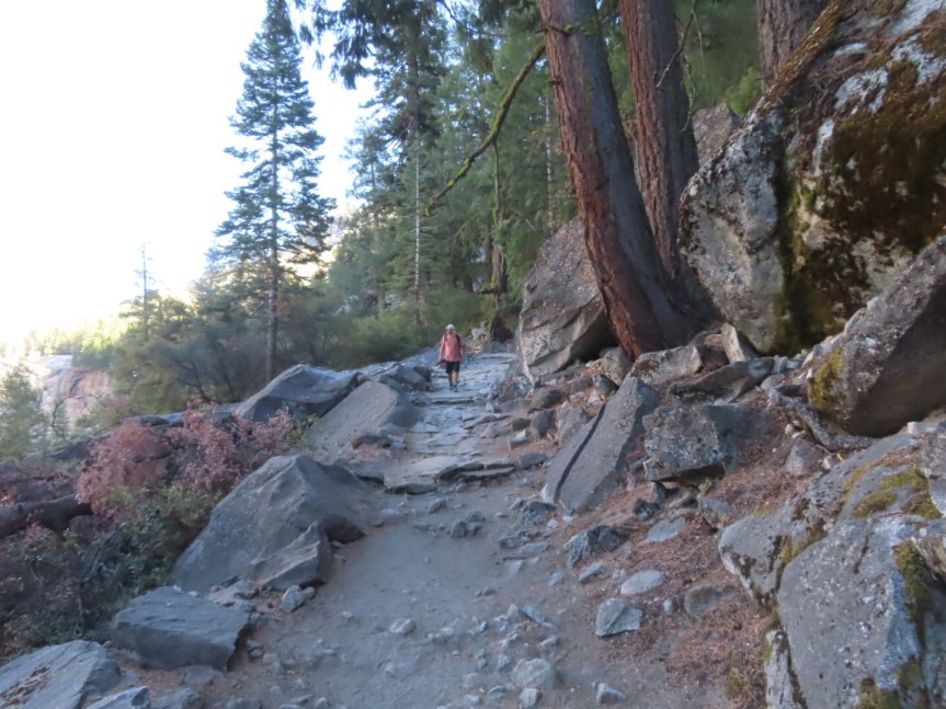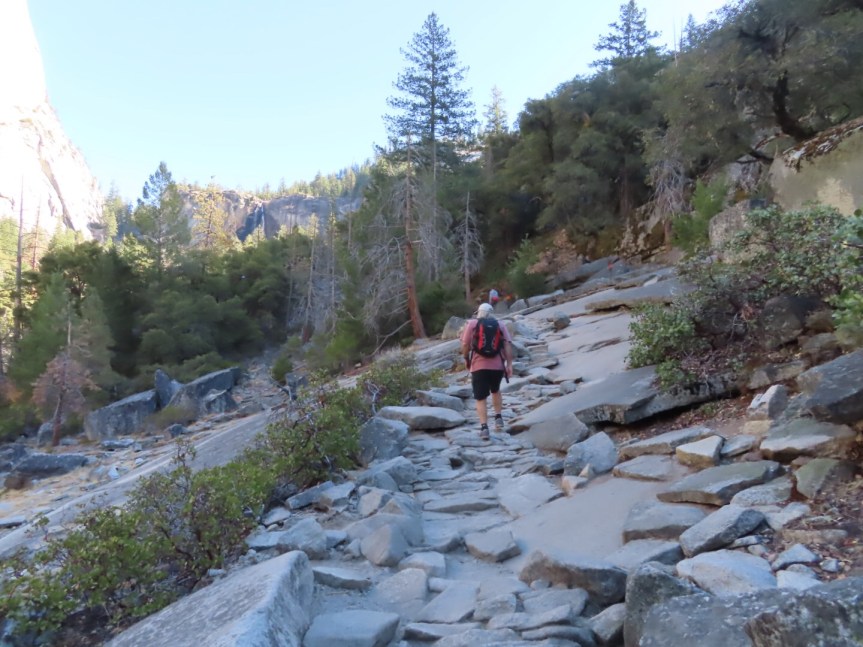 It was close to eleven by the time we trudged out the back end of the campground and hiked our way down to the trailhead for Vernal Falls. The first half of the hike was easy, a little uphill but a nice wide paved path. As we got deeper into the canyon, the trail steepened and narrowed following the river as it spiraled up the gorge.
