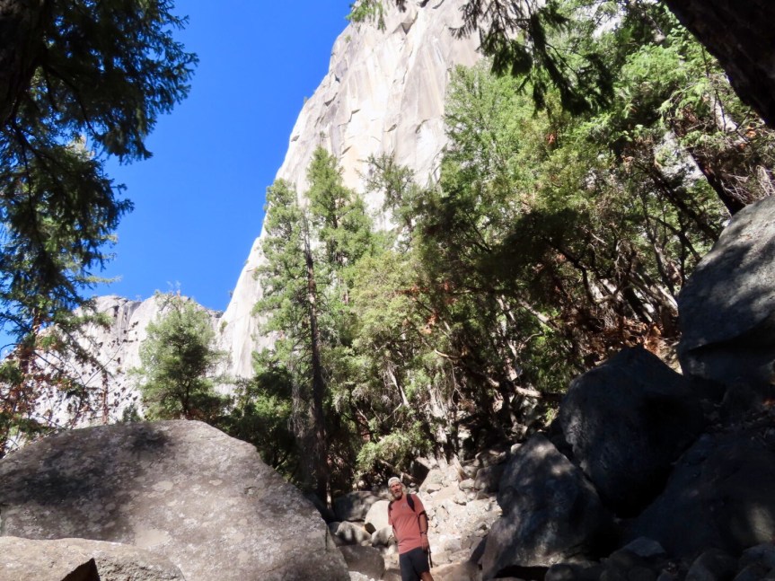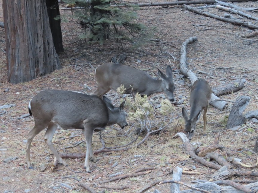 We had about an hour of daylight left when we made it back to the RV five hours after launching our expedition. We leashed up the hound and walked over to North Pines, one of the campgrounds that is closed for the season. We hoping for another bear but Cali must have scared them all away. We let her run free in the empty campground until dark when we headed home for some dinner and to recount our magical day. Yosemite Rocks.