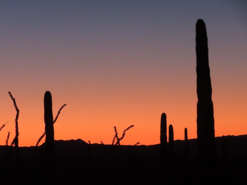 The sun had yet to breach the opening between the cactus covered peaks when I awoke this morning. A faint orange hue had begun to rise from behind the mesas and rocky crags to the east. I tried to convince Cali to come watch the sunrise but she was having none of it. She looked at me like I was out of my mind then grunted and hid her face behind her paws.