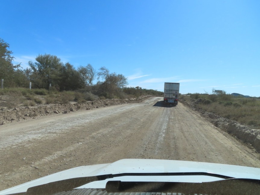 Cali and I were out of the Organ Pipe campground by 8:30 and it was just a few short miles down the road to the border crossing at Lukeville. I like this crossing because it rarely has any other people going through. Sure enough, I pulled right up and even though I punched the red light at the crossing the customs guy just had me park a few spots up and run in to get my tourist card. No one else in the building but me. I was in and out in just a few minutes. But….a few meters up the road, the army had a road block and the young bucks there decided to amuse themselves for a while going through the RV. They rummaged around for a few minutes then sent me down the road.