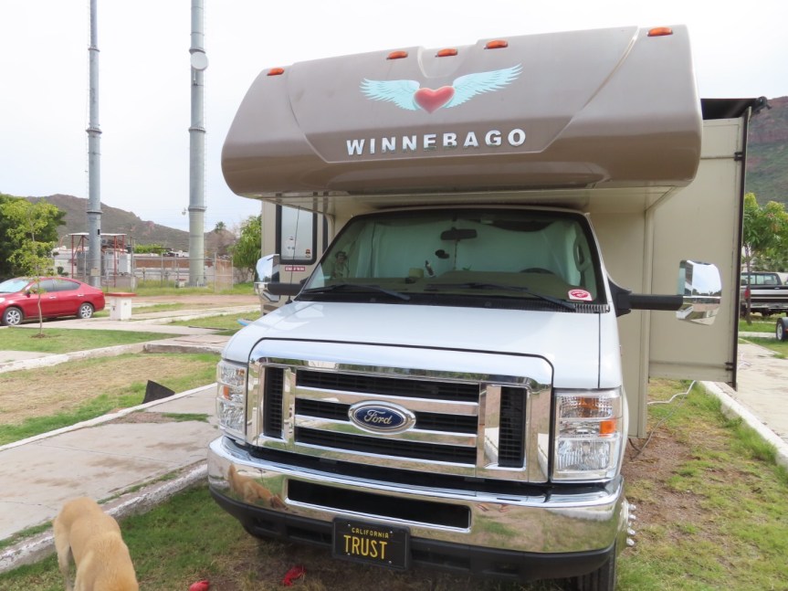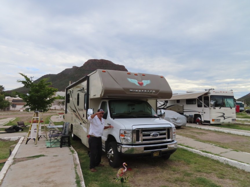 When I awoke this morning, I heard Jim and Linda getting her dad’s big class A ready to drive back up to Arizona. I heated up a cup of tea and went out to say farewell. A number of the hotel staff that were friendly with her father and were around for him during his final days came over to wish them well. This is Jim’s first time driving a bus, so it should be interesting. Just keep it your lane, amigo. He rolled out of the gate with Linda following close behind with the pick up hauling the quad on a trailer. Vaya con Dios.