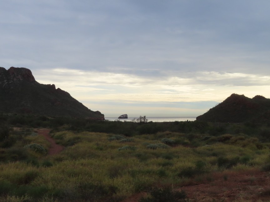 Not wanting to be watching over his shoulder, I jumped on the bike and rode down to Tacos Mazateros and ordered up a fish and a shrimp taco. There was plenty of fish and each taco had two tortillas, so I split them up and made four smaller tacos poquititos. I took my time savoring the tasty Sonoran treats then rode home along the dusty road doing a few errands along the way.