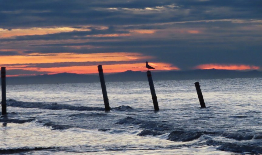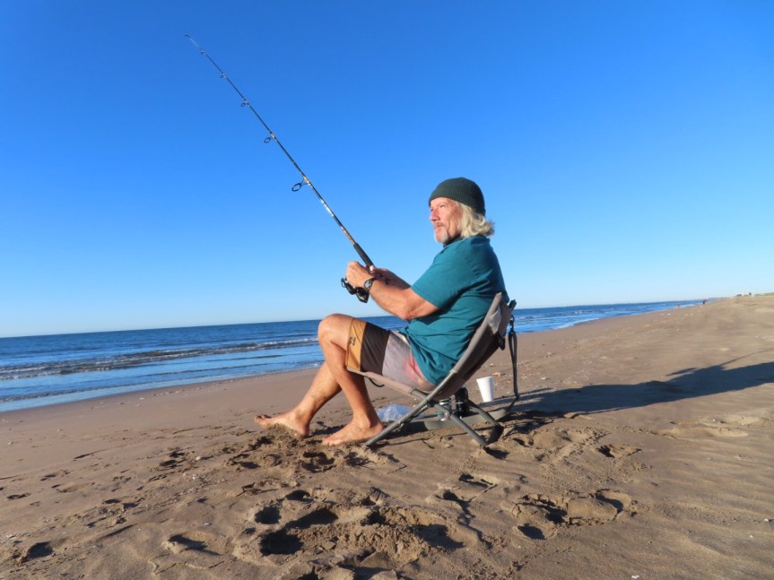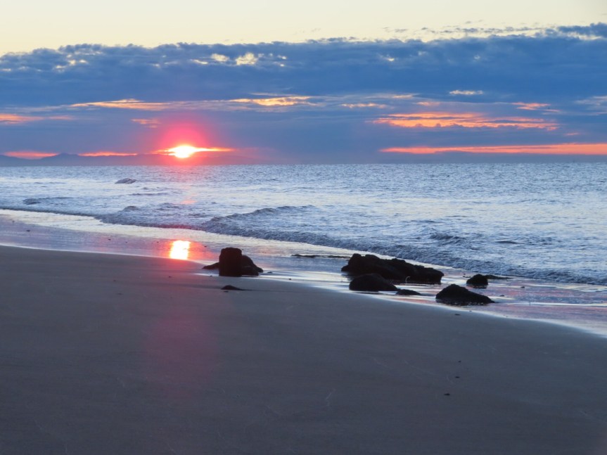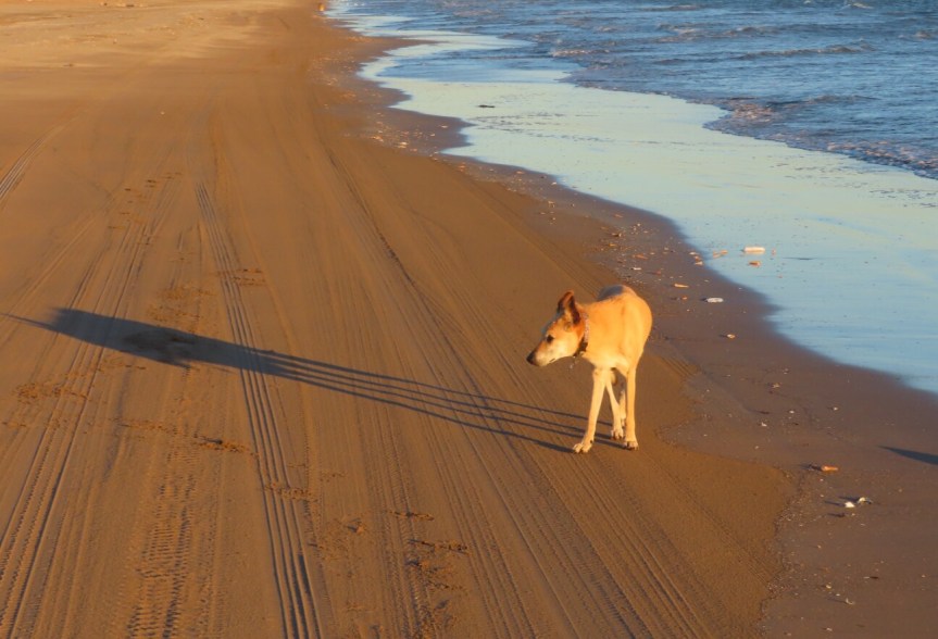 The sun made its arrival and the temperature is promising a gorgeous sunny beach day. A trio of fluffy escorts decided that they needed to help me find my way home so they abandoned their porch and frolicked with me for a ways. A fisherman in a fluorescent green onesie was putting his back into hauling in a net he’d set out the night before. But his effort was in vain as the monofilament web proved empty when he finally got it up on the shore.