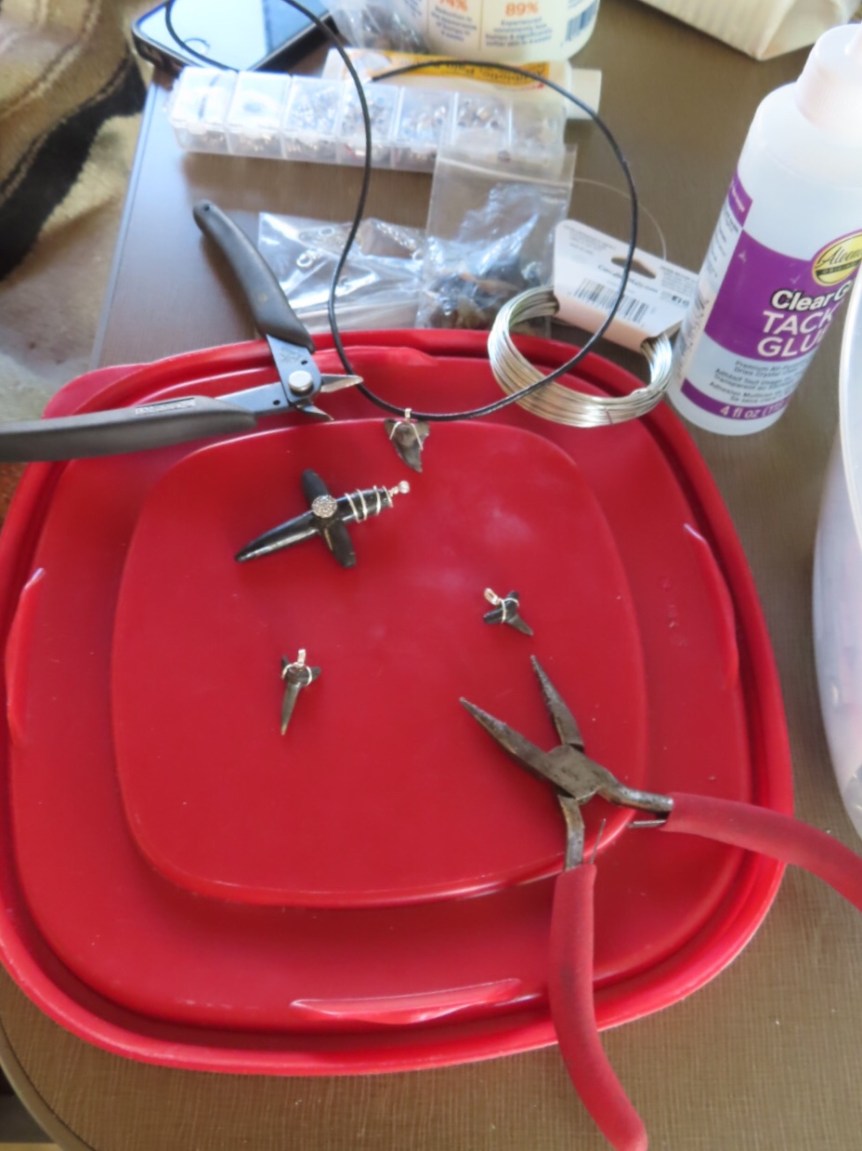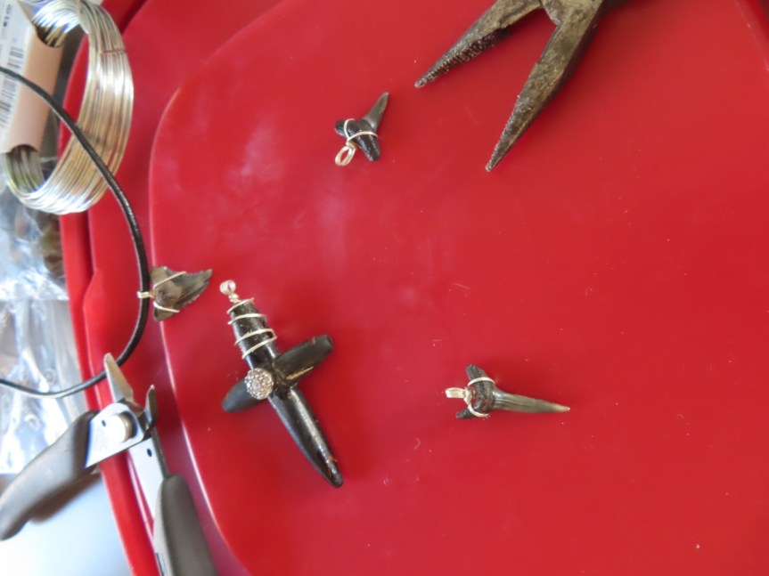 I spent some time in the afternoon wiring up some shark teeth for necklaces and coming up with a silver wire loop so I can hang the coral cross that Enrique gave me yesterday from the mirror . Was that yesterday? Seems ages ago already.