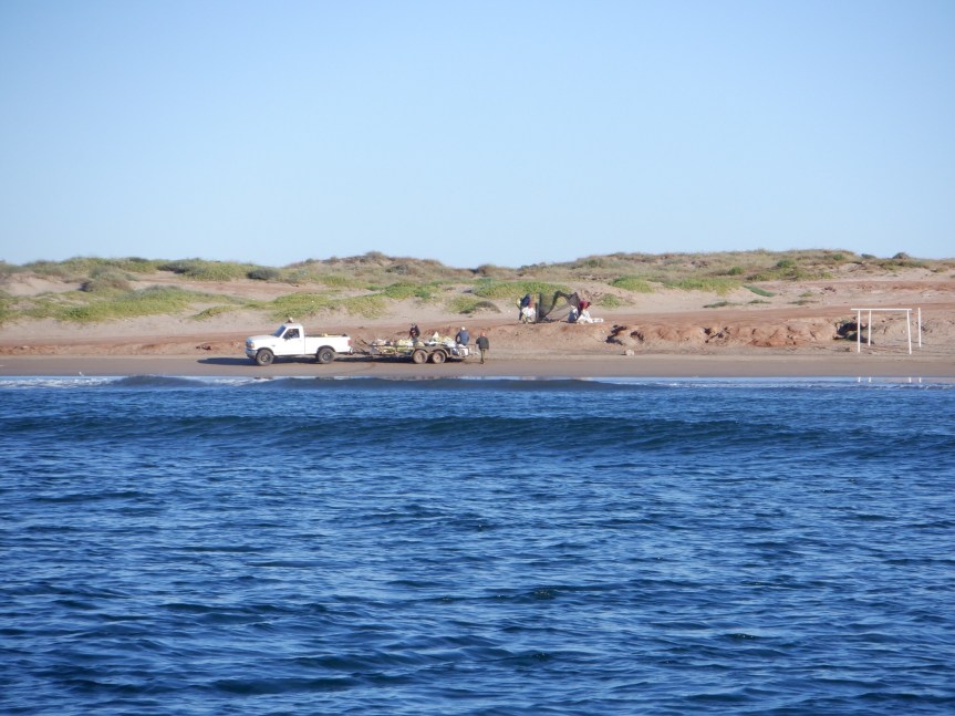 Good thing I jumped on it when I did because by the time I got to my turn around point, the wind had already begun to rise and rise it did. A lone horse watched me carefully from the dunes as I slowly lumbered past. The workers at El Delfin were prepping the restaurant for the Saturday crowds that come out from Obregon, Novajoa and Huatabampo for the weekend fiesta. It was an easy paddle home and then it was oatmeal time out on the sand. The locals had organized a clean up crew and they walked down the beach filling bags with trash and heaping them on a trailer that followed them.