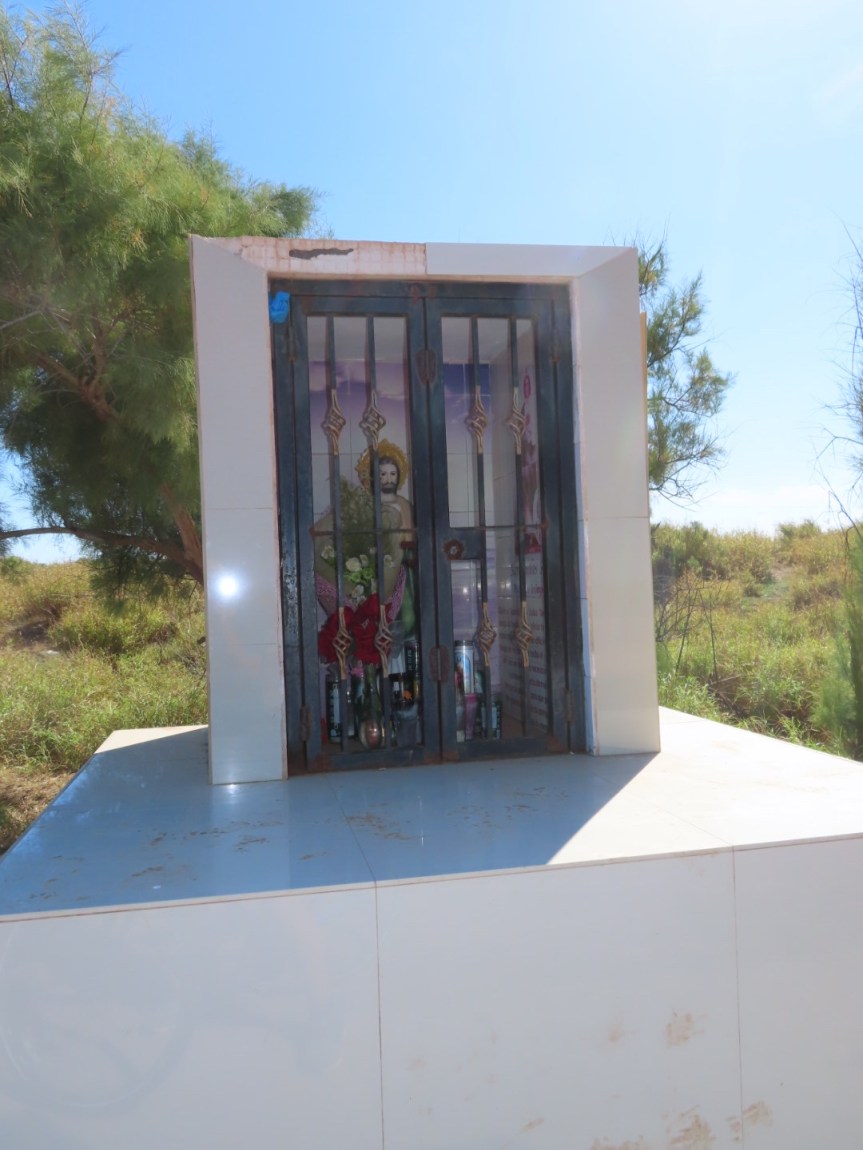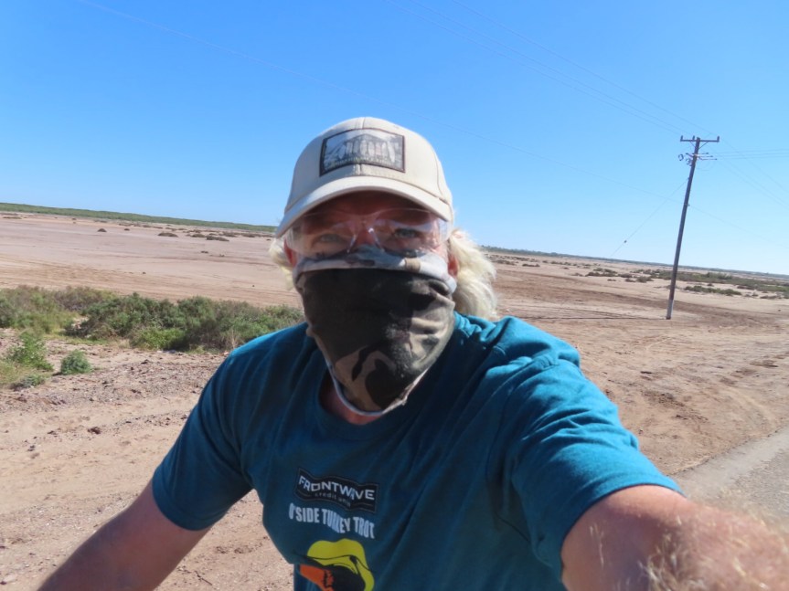 I beared down and put my face into the wind and pedaled hard back to the north. It felt as if I was going uphill on the flats. I pulled up my buff to keep the dust out of my mouth but the sand was blowing into my eyes. As I was wishing I’d brought some sunglasses along, I looked down on the pavement and there was a pair of new looking safety goggles laying right at my wheel. Por Dios! A gift from the heavens. I put them on and pushed through the desert into the dusty little berg of Moroncarit.