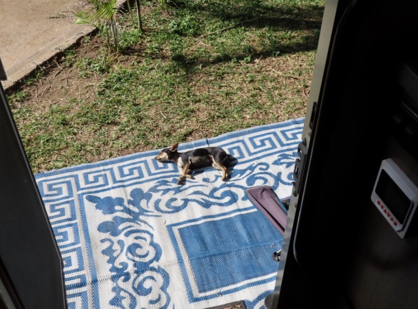 I went as far as the main road into town then gave up on paddling further turning back to make my way home. I caught a few funky, choppy little waves in front of our big palapa then called it a session and went in to have breakfast and lounge out under the awning. Since the place was void of people, I played guitar for an hour or two singing loudly and banging away. Cali had free reign and it was an enjoyable, peaceful day.