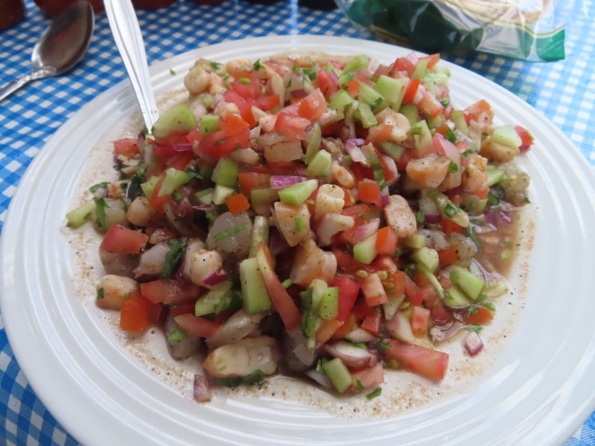 Around one o’clock I was getting hungry so I unwrapped a bicycle and pedaled my way into Celestino Gasca. Luciano had recommended that I visit El Chapo for some seafood. No, not that El Chapo, Mariscos El Chapo at the far end of town. I wandered around the little village until I found it then sat on their patio and ordered up a plate of mixed ceviche – fish, shrimp, octopus and some kind of snail.
