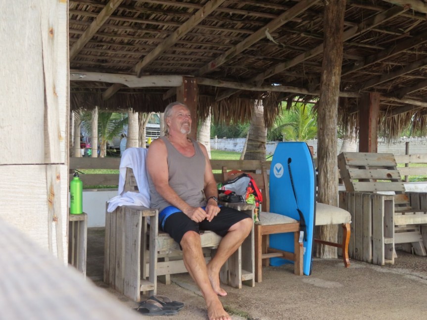 When I got back to the compound, I sat around with Wendy and Kevin from B.C. for a while up in the upper lot. She had stopped by earlier when I was playing music and introduced herself. She’s getting into the ukulele and Kevin had a little keyboard set up. It was hot and humid. The choices going through my mind were nap or jump in the ocean. I took my leave then grabbed the boogie board and went out to ride some bumpy little waves. Nice warm water. I had a lot of fun then came in and dried off up on the patio that overlooks the beach.