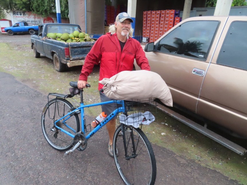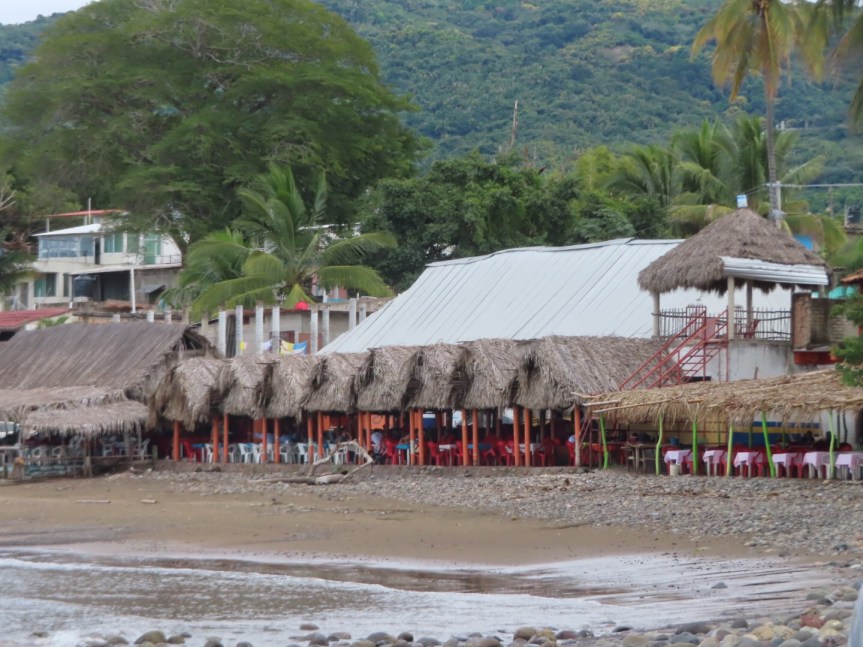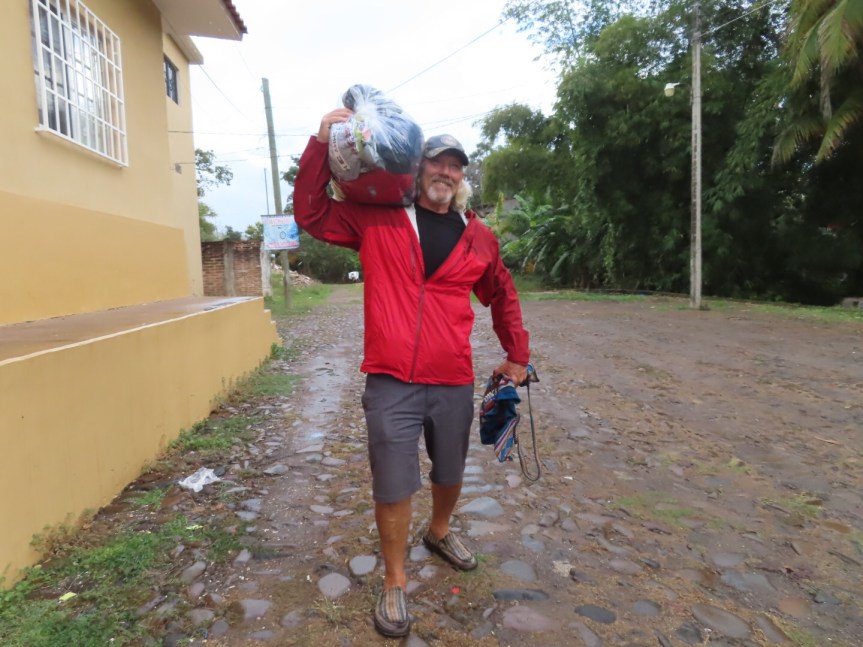 A pretty laid back day at camp. I hung around out on the patio with the dog. It would rain off and on but nothing hard. In the afternoon, Alan and I hiked back up to town to pick up our laundry and see if could find some tacos. Tacos seem to be hard to come by in the coastal towns. Pollo asado and tacos are a weekend’s only thing. We toted our bags of clean clothes back over to the seaside shacks and ordered a couple of plates while watching the sunset. For a Monday, they were doing a fair bit of business. Andrew joined us for a while then we marched back down the beach trying not to get our feet wet while traversing the river on Andrew’s makeshift bridge. He’s still trying to get a 20 peso toll out of us for the crossing.